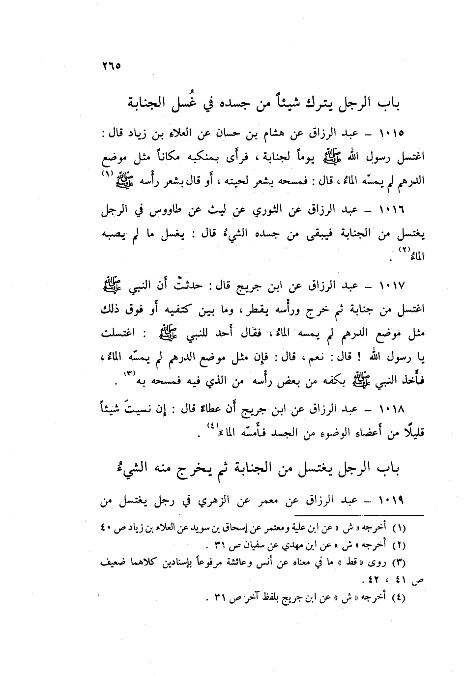 ١٠١٥ - عَبْدُ الرَّزَّاقِ، عَنْ هِشَامِ بْنِ حَسَّانَ، عَنِ الْعَلَاءِ بْنِ زِيَادٍ قَالَ: «اغْتَسَلَ رَسُولُ اللَّهِ صَلَّى اللهُ عَلَيْهِ وَسَلَّمَ يَوْمًا لِجَنَابَةٍ، فَرَأَى بِمَنْكِبِهِ مَكَانًا مِثْلَ مَوْضِعِ الدِّرْهَمِ لَمْ يَمَسَّهُ الْمَاءُ» قَالَ: " فَمَسَحَهُ بِشَعْرِ لِحْيَتِهِ - أَوْ قَالَ: بِشَعْرِ رَأْسِهِ صَلَّى اللهُ عَلَيْهِ وَسَلَّمَ - "