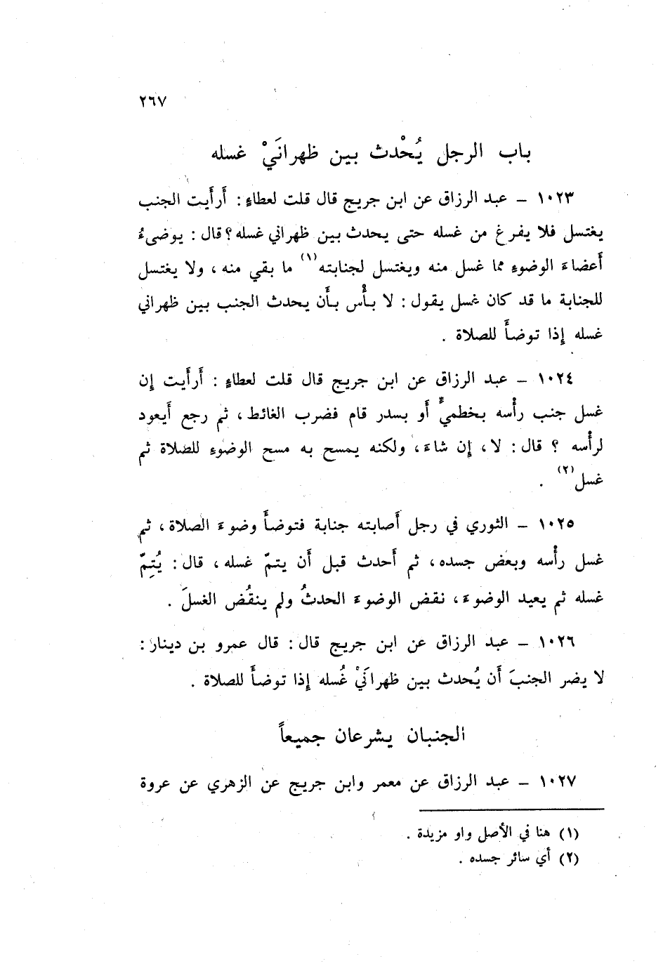 ١٠٢٦ - عَبْدُ الرَّزَّاقِ، عَنِ ابْنِ جُرَيْجٍ قَالَ: قَالَ عَمْرُو بْنُ دِينَارٍ: «لَا يَضُرُّ الْجُنُبَ أَنْ يُحْدِثَ بَيْنَ ظَهْرَانَيْ غُسْلِهِ إِذَا تَوَضَّأَ لِلصَّلَاةِ»