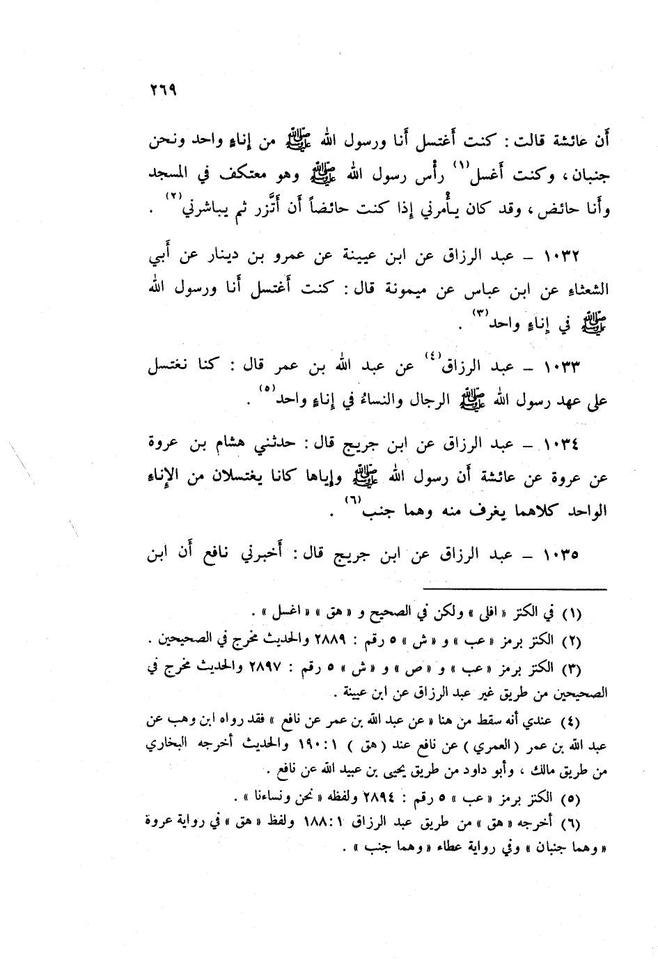 ١٠٣٤ - عَبْدُ الرَّزَّاقِ، عَنِ ابْنِ جُرَيْجٍ قَالَ: حَدَّثَنِي هِشَامُ بْنُ عُرْوَةَ، عَنْ عُرْوَةَ، عَنْ عَائِشَةَ: «أَنَّ رَسُولَ اللَّهِ صَلَّى اللهُ عَلَيْهِ وَسَلَّمَ وَإِيَّاهَا كَانَا يَغْتَسِلَانِ مِنَ الْإِنَاءِ الْوَاحِدِ كِلَاهُمَا يَغْرِفُ مِنْهُ وَهُمَا جُنُبٌ»