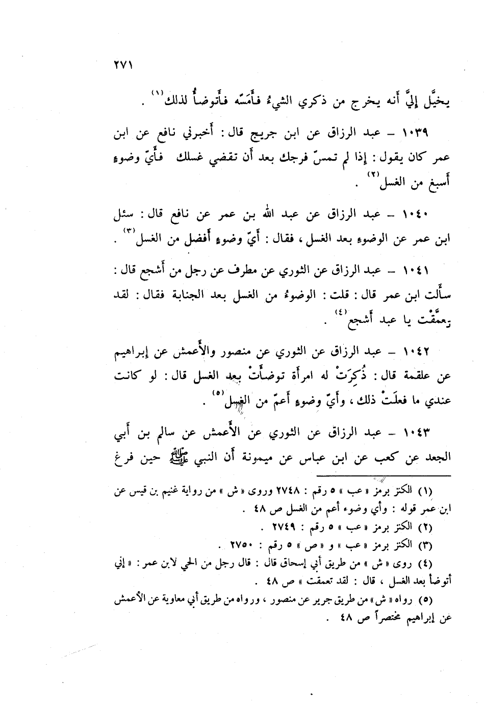 ١٠٣٩ - عَبْدُ الرَّزَّاقِ، عَنِ ابْنِ جُرَيْجٍ قَالَ: أَخْبَرَنِي نَافِعٌ، عَنِ ابْنِ عُمَرَ كَانَ يَقُولُ: «إِذَا لَمْ تَمَسَّ فَرْجَكَ بَعْدَ أَنْ تَقْضِيَ غُسْلَكَ فَأَيُّ وُضُوءٍ أَسْبَغُ مِنَ الْغُسْلِ»