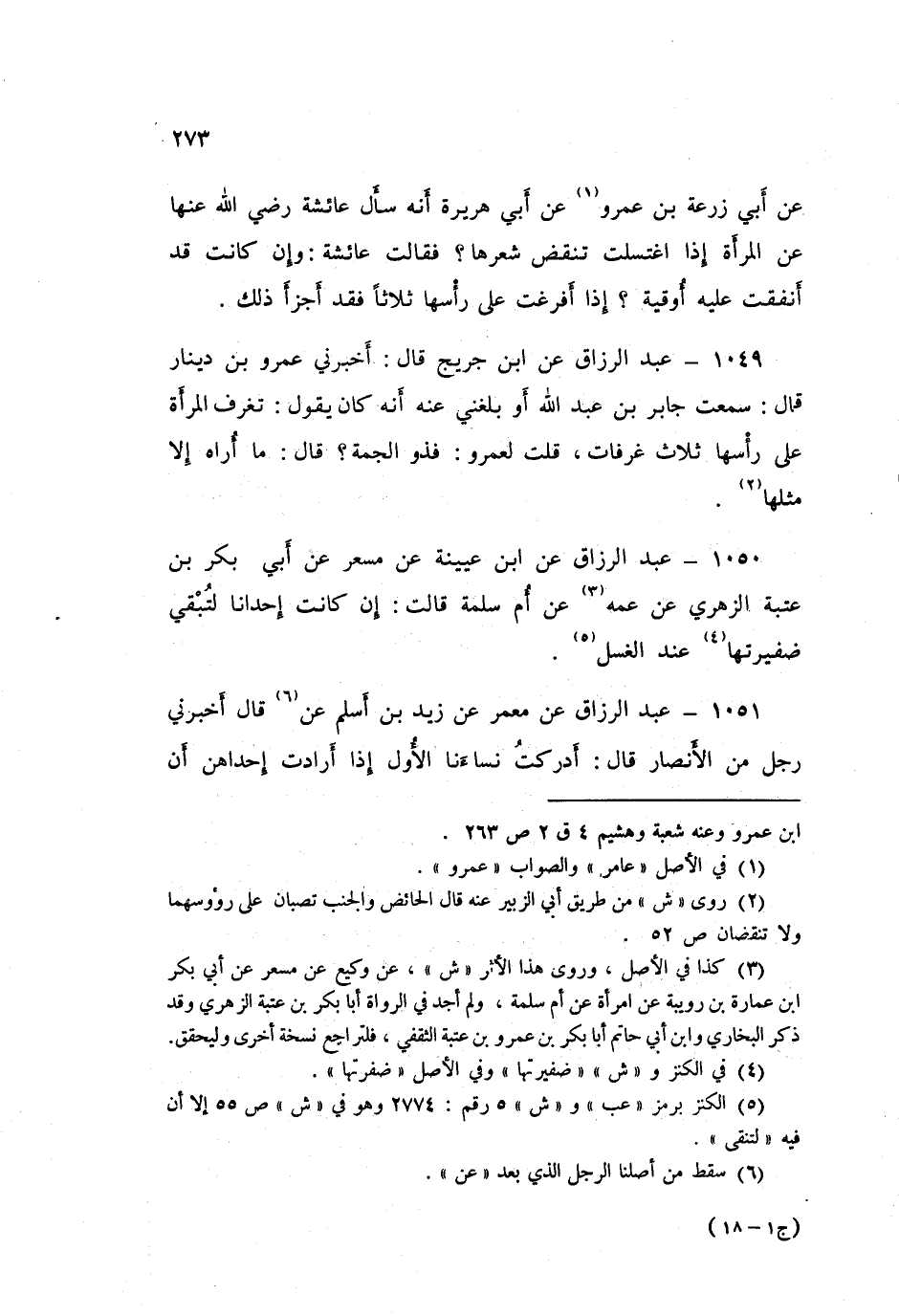 ١٠٤٩ - عَبْدُ الرَّزَّاقِ، عَنِ ابْنِ جُرَيْجٍ قَالَ: أَخْبَرَنِي عَمْرُو بْنُ دِينَارٍ قَالَ: سَمِعْتُ جَابِرَ بْنَ عَبْدِ اللَّهِ، أَوْ بَلَغَنِي عَنْهُ أَنَّهُ كَانَ يَقُولُ: «تَغْرِفُ الْمَرْأَةُ عَلَى رَأْسِهَا ثَلَاثَ غَرَفَاتٍ». قُلْتُ لِعَمْرٍو: فَذُو الْجُمَّةِ؟ قَالَ: «مَا أُرَاهُ إِلَّا مِثْلَهَا»