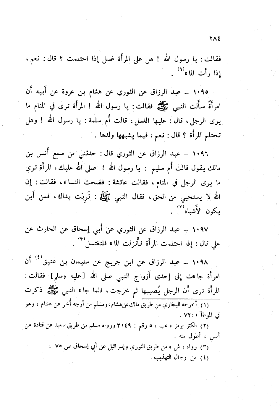 ١٠٩٥ - عَبْدُ الرَّزَّاقِ، عَنِ الثَّوْرِيِّ، عَنْ هِشَامِ بْنِ عُرْوَةَ، عَنْ أَبِيهِ، أَنَّ امْرَأَةً سَأَلَتِ النَّبِيَّ صَلَّى اللهُ عَلَيْهِ وَسَلَّمَ فَقَالَتْ: يَا رَسُولَ اللَّهِ الْمَرْأَةُ تَرَى فِي الْمَنَامِ مَا يَرَى الرَّجُلُ؟ قَالَ: «عَلَيْهَا الْغُسْلُ» قَالَتْ أُمُّ سَلَمَةَ: يَا رَسُولَ اللَّهِ وَهَلْ تَحْتَلِمُ الْمَرْأَةُ؟ قَالَ: «نَعَمْ. فَبِمَا يُشْبِهُهَا وَلَدُهَا»