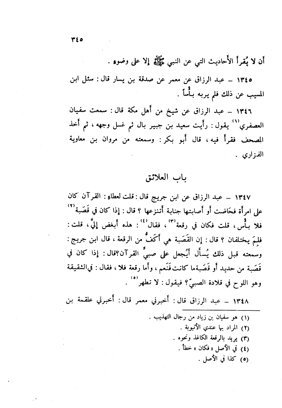١٣٤٦ - عَبْدُ الرَّزَّاقِ، عَنْ شَيْخٍ مِنْ أَهْلِ مَكَّةَ قَالَ: سَمِعْتُ سُفْيَانَ الْعُصْفُرِيَّ يَقُولُ: رَأَيْتُ سَعِيدَ بْنَ جُبَيْرٍ، «بَالَ، ثُمَّ غَسَلَ وَجْهَهُ، ثُمَّ أَخَذَ الْمُصْحَفَ فَقَرَأَ فِيهِ». قَالَ أَبُو بَكْرٍ: وَسَمِعْتُهُ مِنْ مَرْوَانَ بْنِ مُعَاوِيَةَ الْفَزَارِيِّ