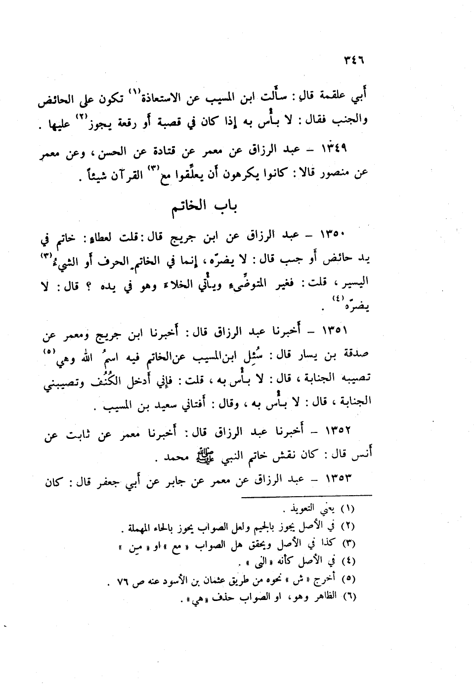 ١٣٥١ - أَخْبَرَنَا عَبْدُ الرَّزَّاقِ قَالَ: أَخْبَرَنَا ابْنُ جُرَيْجٍ، وَمَعْمَرٌ، عَنْ صَدَقَةَ بْنِ يَسَارٍ قَالَ: سُئِلَ ابْنُ الْمُسَيِّبِ، عَنِ الْخَاتَمِ فِيهِ اسْمُ اللَّهِ وَهِيَ تُصِيبُهُ الْجَنَابَةُ قَالَ: «لَا بَأْسَ بِهِ» قُلْتُ: فَإِنِّي أَدْخُلُ الْكُنُفَ، وَتُصِيبُنِي الْجَنَابَةُ قَالَ: «لَا بَأْسَ بِهِ» وَقَالَ: أَفْتَانِي سَعِيدُ بْنُ الْمُسَيِّبِ