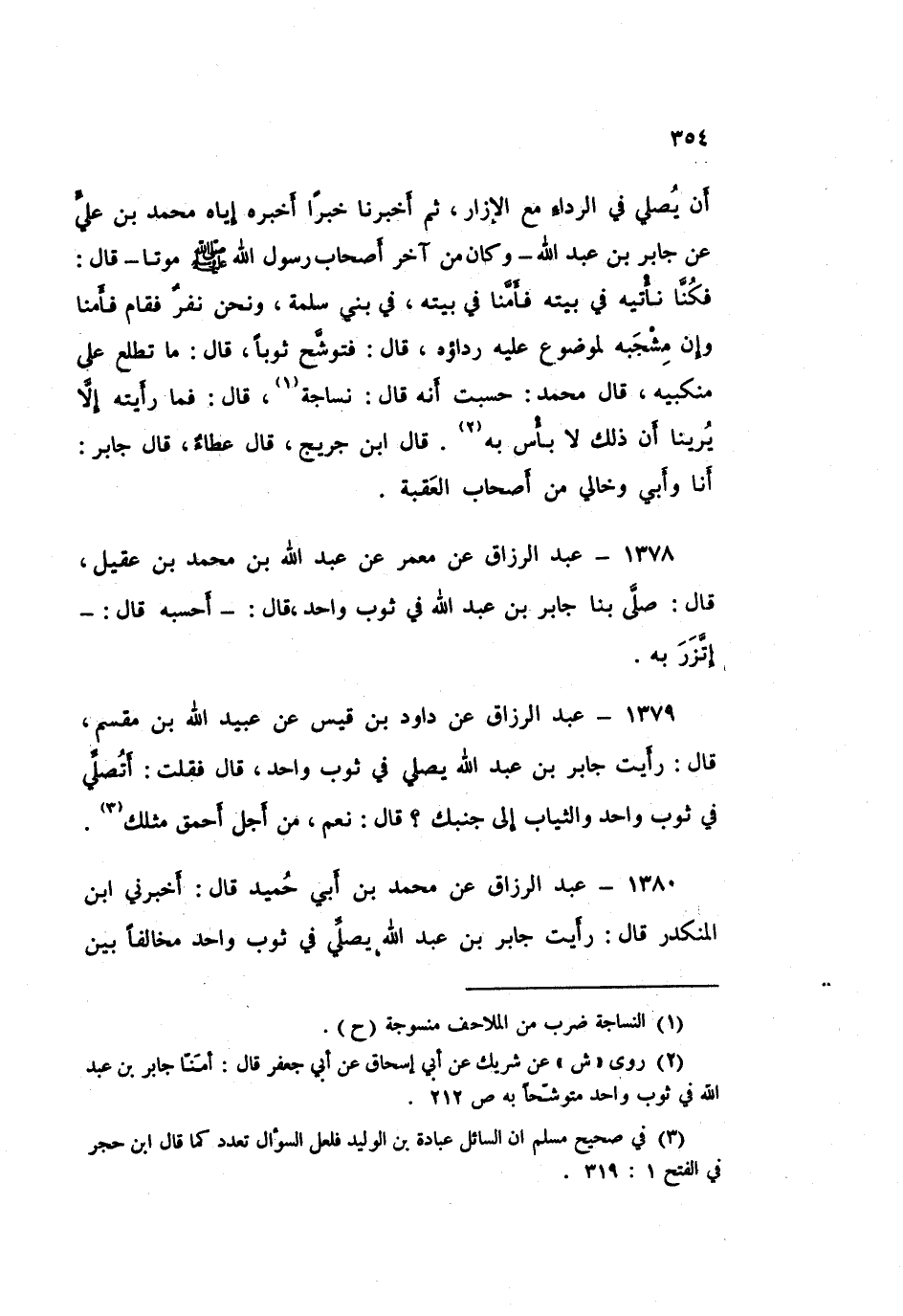 ١٣٨٠ - عَبْدُ الرَّزَّاقِ، عَنْ مُحَمَّدِ بْنِ أَبِي حُمَيْدٍ قَالَ: أَخْبَرَنِي ابْنُ الْمُنْكَدِرِ قَالَ: رَأَيْتُ جَابِرَ بْنَ عَبْدِ اللَّهِ «يُصَلِّي فِي ثَوْبٍ وَاحِدٍ مُخَالِفًا بَيْنَ طَرَفَيْهِ»