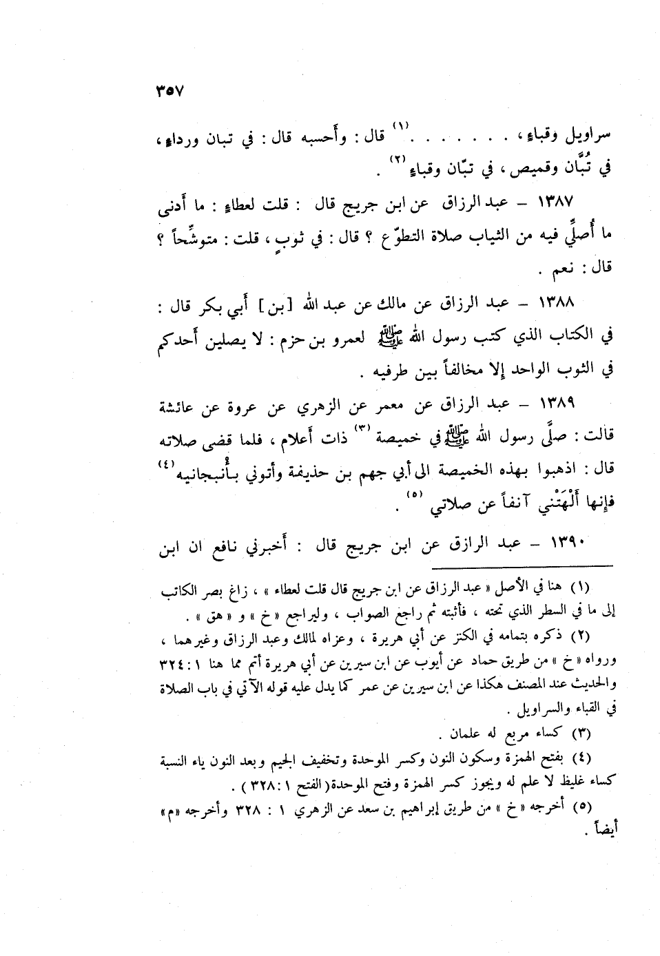 ١٣٨٧ - عَبْدُ الرَّزَّاقِ، عَنِ ابْنِ جُرَيْجٍ قَالَ: قُلْتُ لِعَطَاءٍ: مَا أَدْنَى مَا أُصَلِّي فِيهِ مِنَ الثِّيَابِ صَلَاةَ التَّطَوُّعِ؟ قَالَ: «فِي ثَوْبٍ» قُلْتُ: «مُتَوَشِّحًا؟» قَالَ: «نَعَمْ»