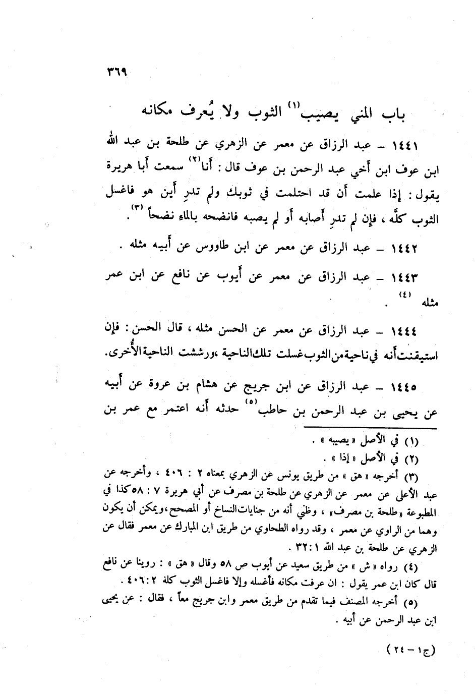 ١٤٤١ - عَبْدُ الرَّزَّاقِ، عَنْ مَعْمَرٍ، عَنِ الزُّهْرِيِّ، عَنْ طَلْحَةَ بْنِ عَبْدِ اللَّهِ بْنِ عَوْفٍ ابْنِ أَخِي عَبْدِ الرَّحْمَنِ بْنِ عَوْفٍ قَالَ: أَنَا سَمِعْتُ أَبَا هُرَيْرَةَ يَقُولُ: «إِذَا عَلِمْتَ أَنْ قَدِ احْتَلَمْتَ فِي ثَوْبِكَ، وَلَمْ تَدْرِ أَيْنَ هُوَ، فَاغْسِلِ الثَّوْبَ كُلَّهُ، فَإِنْ لَمْ تَدْرِ أَصَابَهُ أَوْ لَمْ يُصِبْهُ فَانْضَحْهُ بِالْمَاءِ نَضْحًا».