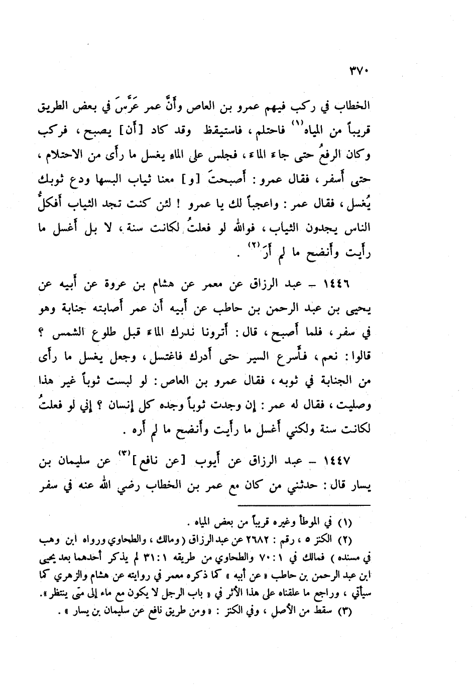 ١٤٤٦ - عَبْدُ الرَّزَّاقِ، عَنْ مَعْمَرٍ، عَنْ هِشَامِ بْنِ عُرْوَةَ، عَنْ أَبِيهِ، عَنْ يَحْيَى بْنِ عَبْدِ الرَّحْمَنِ بْنِ حَاطِبٍ، عَنْ أَبِيهِ، أَنَّ عُمَرَ أَصَابَتْهُ جَنَابَةٌ وَهُوَ فِي سَفَرٍ، فَلَمَّا أَصْبَحَ قَالَ: «أَتَرَوْنَا نُدْرِكُ الْمَاءَ قَبْلَ طُلُوعِ الشَّمْسِ؟» قَالُوا: نَعَمْ، فَأَسْرَعَ السَّيْرَ حَتَّى أَدْرَكَ فَاغْتَسَلَ وَجَعَلَ يَغْسِلُ مَا رَأَى مِنَ الْجَنَابَةِ فِي ثَوْبِهِ، فَقَالَ عَمْرُو بْنُ الْعَاصِ: لَوْ لَبِسْتُ ثَوْبًا غَيْرَ هَذَا وَصَلَّيْتُ؟ فَقَالَ لَهُ عُمَرُ: «إِنْ وَجَدْتَ ثَوْبًا وَجَدَهُ كُلُّ إِنْسَانٍ إِنِّي لَوْ فَعَلْتُ لَكَانَتْ سُنَّةً وَلَكِنِّي أَغْسِلُ مَا رَأَيْتُ، وَأَنْضَحُ مَا لَمْ أَرَهْ»