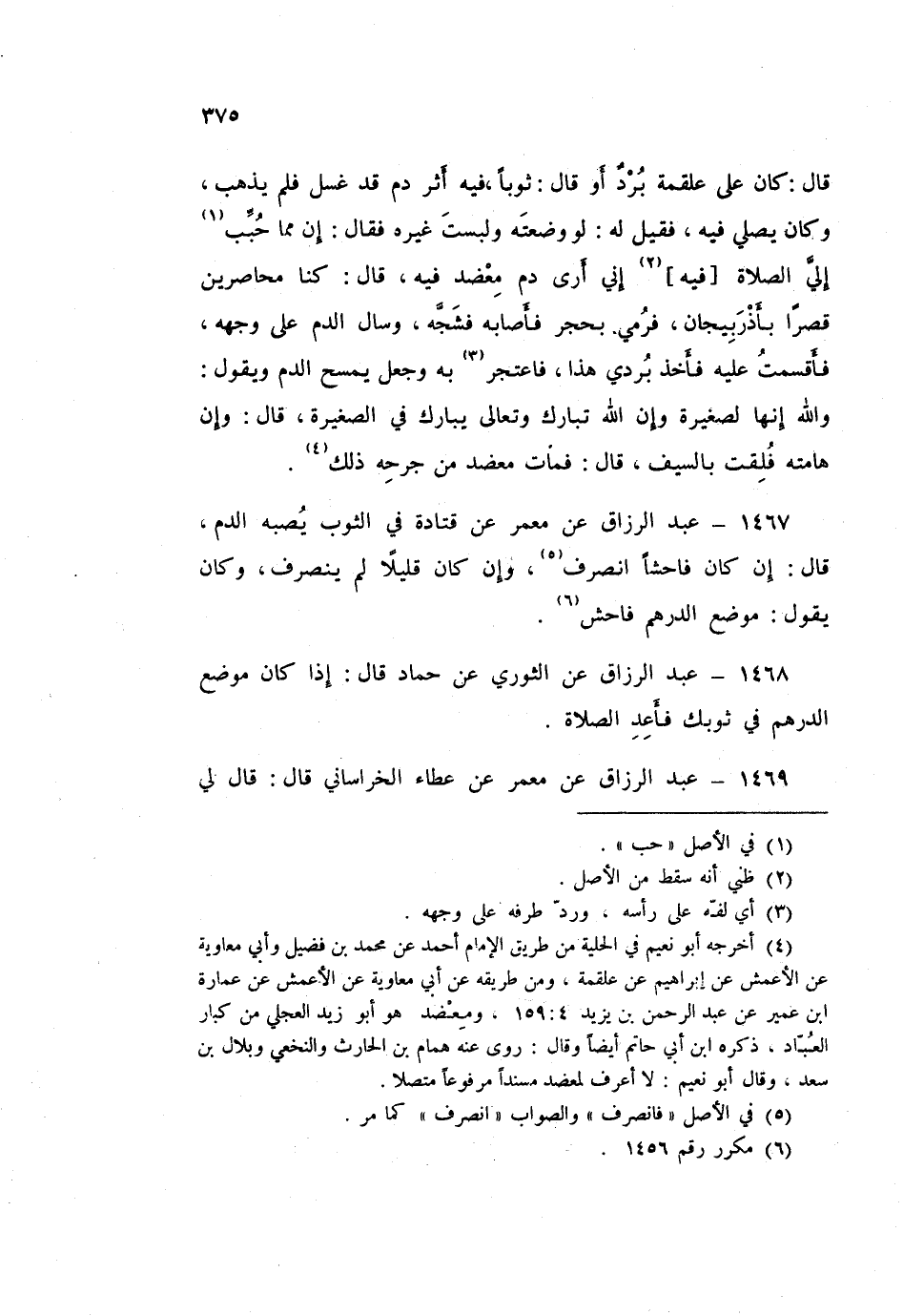 ١٤٦٩ - عَبْدُ الرَّزَّاقِ، عَنْ مَعْمَرٍ، عَنْ عَطَاءٍ الْخُرَاسَانِيِّ قَالَ: قَالَ لِي عَطَاءٌ: «لَقَدْ صَلَّيْتُ فِي ثَوْبِي هَذَا مِرَارًا فِيهِ دَمٌ فَنَسِيتُ أَنْ أَغْسِلَهُ»