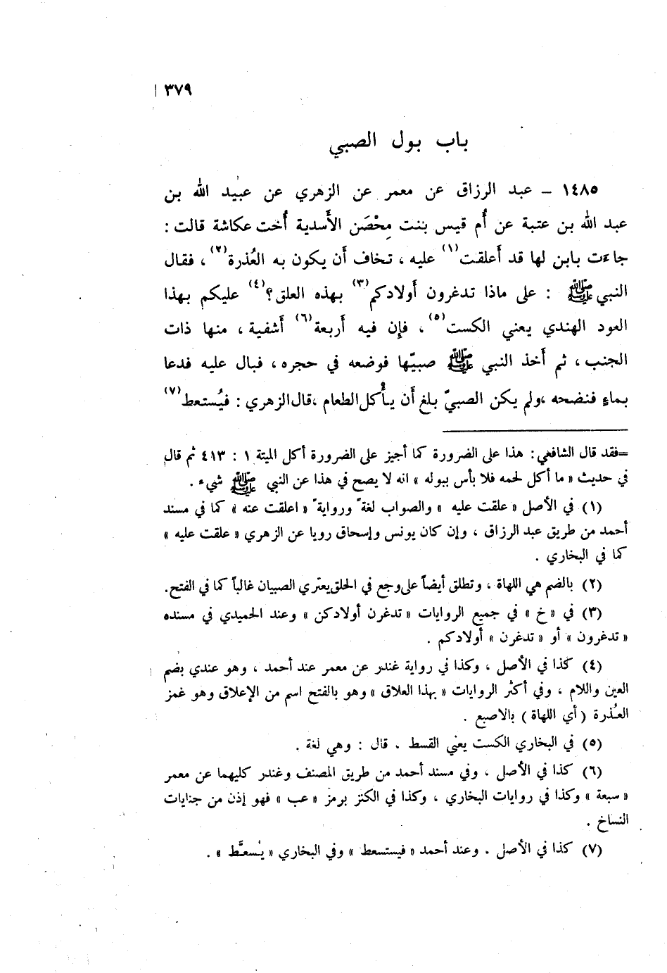١٤٨٥ - عَبْدُ الرَّزَّاقِ، عَنْ مَعْمَرٍ، عَنِ الزُّهْرِيِّ، عَنْ عُبَيْدِ اللَّهِ بْنِ عَبْدِ اللَّهِ بْنِ عُتْبَةَ، عَنْ أُمِّ قَيْسِ بِنْتِ مِحْصَنٍ الْأَسَدِيَّةِ أُخْتِ عُكَّاشَةَ قَالَتْ: جَاءَتْ بَابْنٍ لَهَا قَدْ أَعْلَقَتْ عَلَيْهِ تَخَافُ أَنْ يَكُونَ بِهِ الْعُذْرَةُ، فَقَالَ النَّبِيُّ صَلَّى اللهُ عَلَيْهِ وَسَلَّمَ: «عَلَى مَاذَا تَدْغَرُونَ أَوْلَادَكُمْ بِهَذِهِ الْعِلَقِ؟ عَلَيْكُمْ بِهَذَا الْعُودِ الْهِنْدِيِّ ـ يَعْنِي الْكُسْتَ ـ فَإِنَّ فِيهِ أَرْبَعَةَ أَشْفِيَةٍ، مِنْهَا ذَاتُ الْجُنُبِ» ثُمَّ أَخَذَ النَّبِيُّ صَلَّى اللهُ عَلَيْهِ وَسَلَّمَ صَبِيَّهَا، فَوَضَعَهُ فِي حِجْرِهِ فَبَالَ عَلَيْهِ فَدَعَا بِمَاءٍ فَنَضَحَهُ وَلَمْ يَكُنِ الصَّبِيُّ بَلَغَ أَنْ يَأْكُلَ الطَّعَامَ. قَالَ الزُّهْرِيُّ: فَيُسْتَعَطُ ⦗٣٨٠⦘ لِلْعُذْرَةِ، وَيُلَدُّ مِنْ ذَاتِ الْجُنُبِ، قَالَ الزُّهْرِيُّ: فَمَضَتِ السُّنَّةُ أَنْ يُرَشَّ بَوْلُ الصَّبِيِّ وَيُغْسَلُ بَوْلُ الْجَارِيَةِ