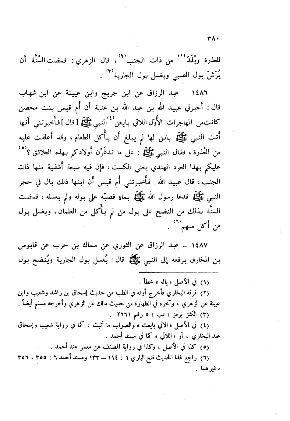 ١٤٨٧ - عَبْدُ الرَّزَّاقِ، عَنِ الثَّوْرِيِّ، عَنْ سِمَاكِ بْنِ حَرْبٍ، عَنْ قَابُوسَ بْنِ الْمُخَارِقِ، يَرْفَعُهُ إِلَى النَّبِيِّ صَلَّى اللهُ عَلَيْهِ وَسَلَّمَ قَالَ: «يُغْسَلُ بَوْلُ الْجَارِيَةِ، وَيُنْضَحُ بَوْلُ الصَّبِيِّ». قَالَ سُفْيَانُ: " وَنَحْنُ نَقُولُ: مَا لَمْ يَطْعَمِ الطَّعَامَ "
