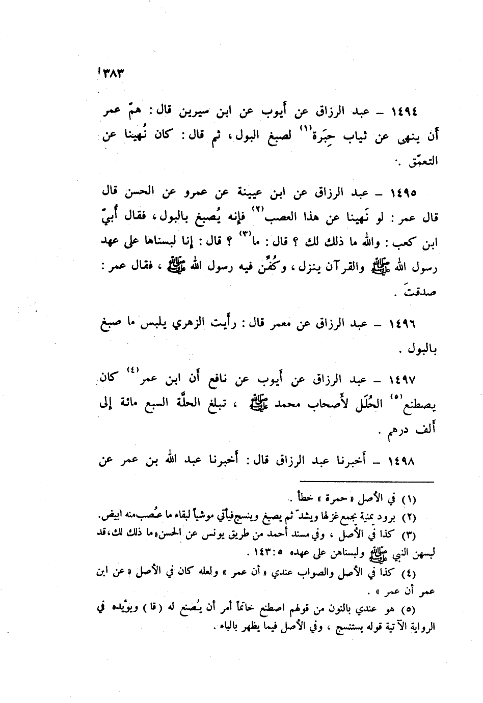 ١٤٩٤ - عَبْدُ الرَّزَّاقِ، عَنْ أَيُّوبَ، عَنِ ابْنِ سِيرِينَ قَالَ: هَمَّ عُمَرُ، أَنْ يَنْهَى عَنْ ثِيَابِ حِبَرَةَ لِصَبْغِ الْبَوْلِ، ثُمَّ قَالَ: «كُنَّا نُهِينَا، عَنِ التَّعَمُّقِ»