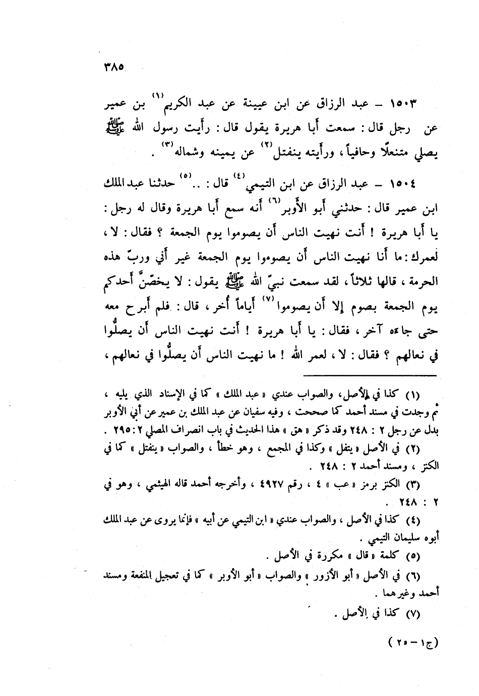 ١٥٠٤ - عَبْدُ الرَّزَّاقِ، عَنِ ابْنِ التَّيْمِيِّ قَالَ: حَدَّثَنَا عَبْدُ الْمَلِكِ بْنُ عُمَيْرٍ قَالَ: حَدَّثَنِي أَبُو الْأَوْبَرِ، أَنَّهُ سَمِعَ أَبَا هُرَيْرَةَ، وَقَالَ لَهُ رَجُلٌ: يَا أَبَا هُرَيْرَةَ، أَنْتَ نَهَيْتَ النَّاسَ أَنْ يَصُوَمُوا يَوْمَ الْجُمُعَةِ؟ فَقَالَ: لَا لَعَمْرُكَ مَا أَنَا نَهَيْتُ النَّاسَ أَنْ يَصُوَمُوا يَوْمَ الْجُمُعَةِ غَيْرَ أَنِّي وَرَبِّ هَذِهِ الْحُرْمَةِ، قَالَهَا ثَلَاثًا لَقَدْ سَمِعْتُ نَبِيَّ اللَّهِ صَلَّى اللهُ عَلَيْهِ وَسَلَّمَ يَقُولُ: «لَا يَخُصَّنَّ أَحَدُكُمْ يَوْمَ الْجُمُعَةِ بِصَوْمٍ إِلَّا أَنْ يَصُوَمُوا أيَّامًا أُخَرَ» قَالَ: فَلَمْ أَبْرَحْ مَعَهُ حَتَّى جَاءَهُ آخَرُ، فَقَالَ: يَا أَبَا هُرَيْرَةَ، أَنْتَ نَهَيْتَ النَّاسَ أَنْ يُصَلُّوا فِي نِعَالِهِمْ؟ فَقَالَ: لَا لَعَمْرُ اللَّهِ مَا نَهَيْتُ النَّاسَ أَنْ يُصَلُّوا فِي نِعَالِهِمْ ⦗٣٨٦⦘ غَيْرَ أَنِّي وَرَبِّ هَذِهِ الْحُرْمَةِ حَتَّى قَالَهَا: ثَلَاثًا، لَقَدْ رَأَيْتُ النَّبِيَّ صَلَّى اللهُ عَلَيْهِ وَسَلَّمَ، هَا هُنَا عِنْدَ الْمَقَامِ يُصَلِّي وَعَلَيْهِ نَعْلَاهُ، ثُمَّ انْصَرَفَ وَهُمَا عَلَيْهِ
