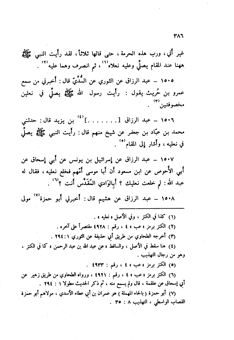 ١٥٠٨ - عَبْدُ الرَّزَّاقِ، عَنْ هُشَيْمٍ قَالَ: أَخْبَرَنِي أَبُو حَمْزَةَ، مَوْلَى بَنِي أَسَدٍ قَالَ: رَأَيْتُ ابْنَ عَبَّاسٍ، «يُصَلِّي فِي نَعْلَيْهِ»