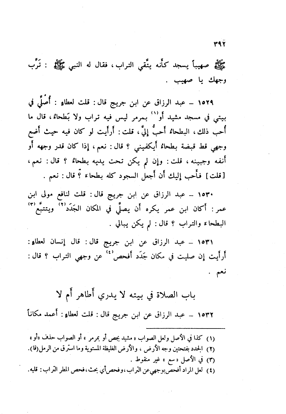١٥٣١ - عَبْدُ الرَّزَّاقِ، عَنِ ابْنِ جُرَيْجٍ قَالَ: قَالَ إِنْسَانٌ لِعَطَاءٍ: أَرَأَيْتَ إِنْ صَلَّيْتُ فِي مَكَانٍ جَدَدٍ أَفْحَصُ، عَنْ وَجْهِي التُّرَابَ؟ قَالَ: «نَعَمْ»