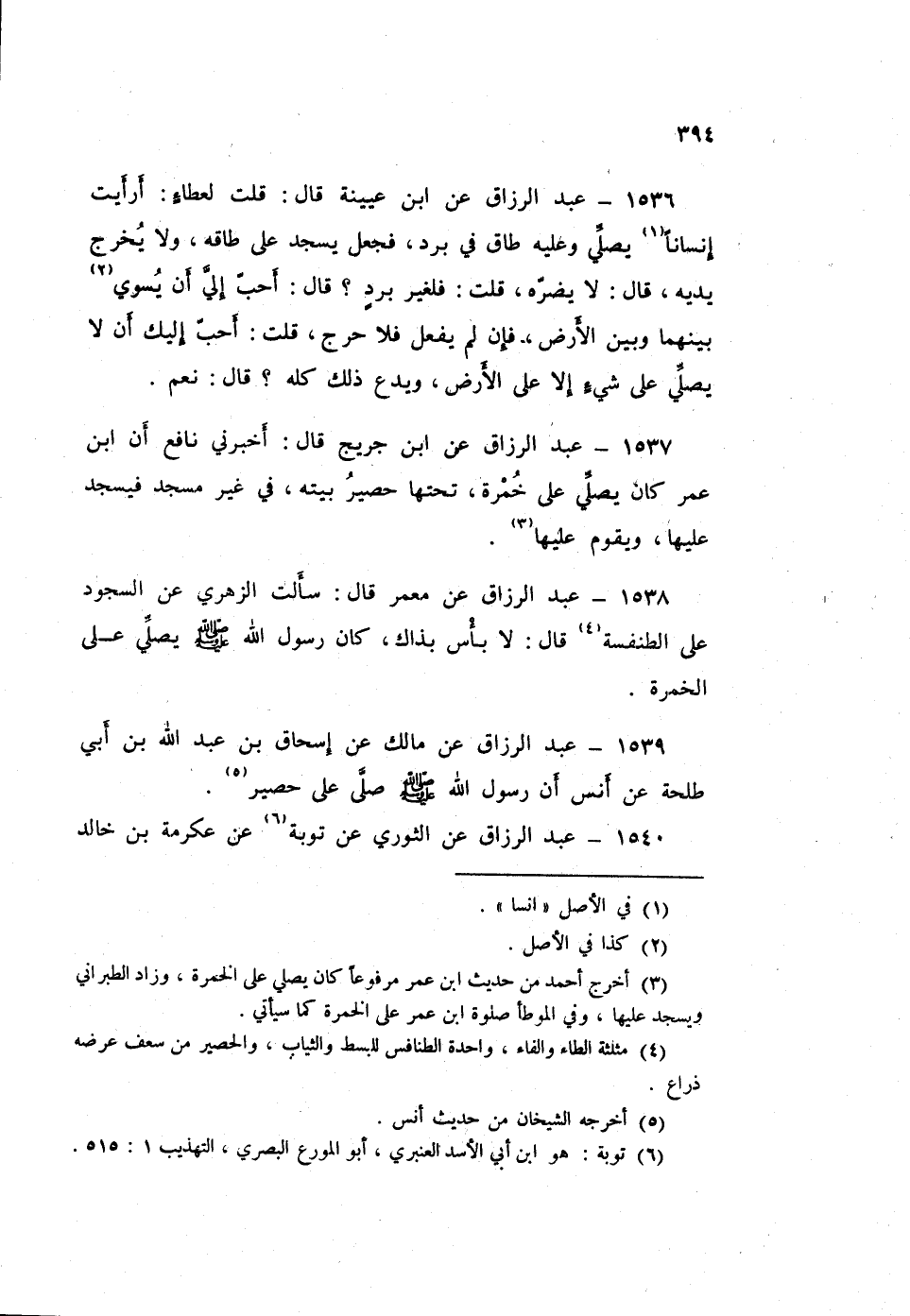 ١٥٣٨ - عَبْدُ الرَّزَّاقِ، عَنْ مَعْمَرٍ سَأَلْتُ: الزُّهْرِيَّ، عَنِ السُّجُودِ عَلَى الطَّنْفَسَةِ؟ قَالَ: لَا بَأْسَ بِذَاكَ كَانَ رَسُولُ اللَّهِ صَلَّى اللهُ عَلَيْهِ وَسَلَّمَ «يُصَلِّي عَلَى الْخُمْرَةِ»