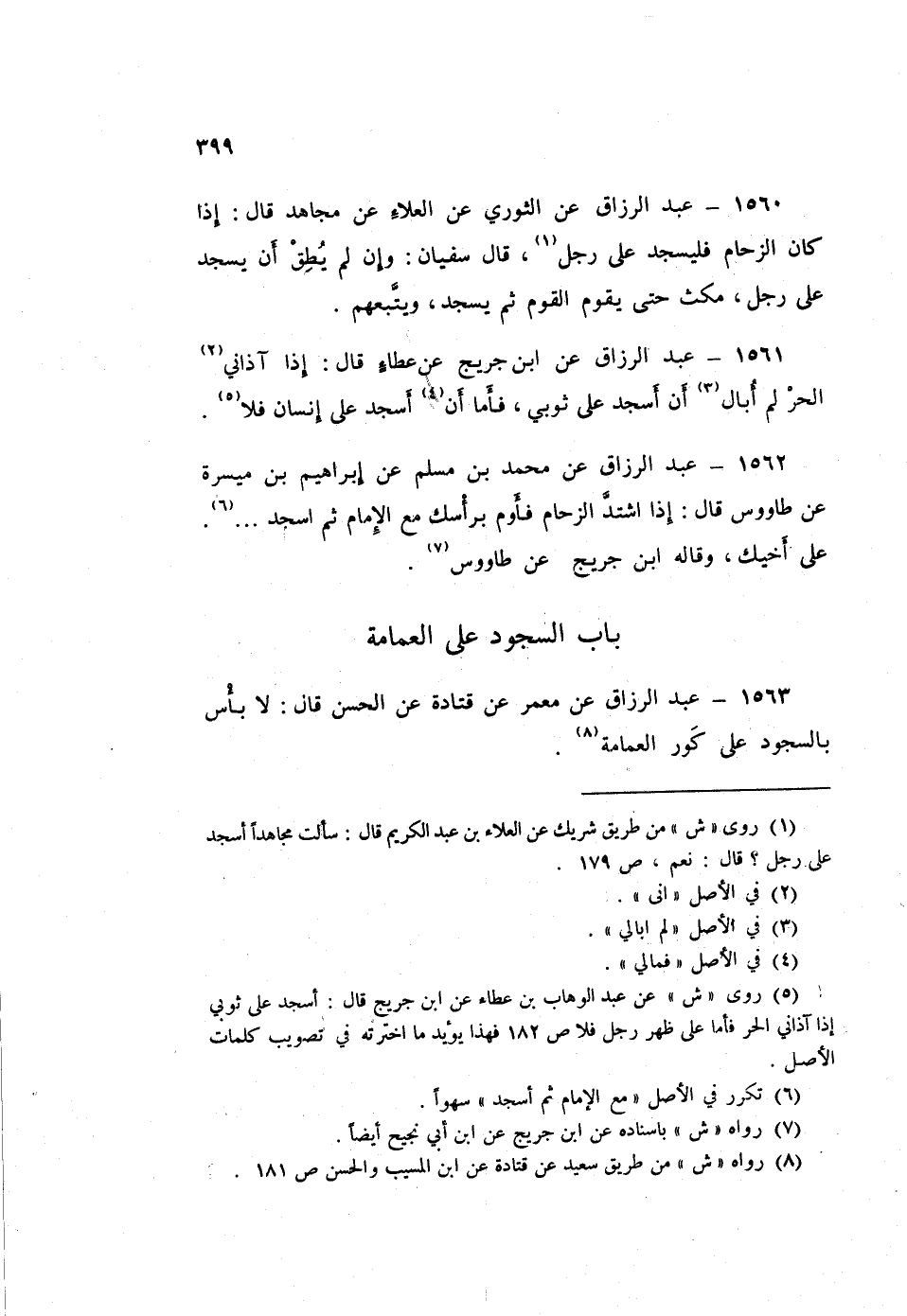 ١٥٦٢ - عَبْدُ الرَّزَّاقِ، عَنْ مُحَمَّدِ بْنِ مُسْلِمٍ، عَنْ إِبْرَاهِيمَ بْنِ مَيْسَرَةَ، عَنْ طَاوُسٍ قَالَ: «إِذَا اشْتَدَّ الزِّحَامُ فَأَوْمِ بِرَأْسِكَ مَعَ الْإِمَامِ، ثُمَّ اسْجُدْ عَلَى أَخِيكَ»، وَقَالَهُ ابْنُ جُرَيْجٍ: عَنْ طَاوُسٍ