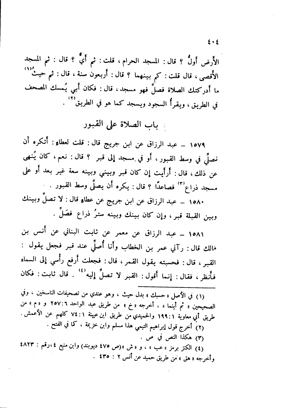 ١٥٨١ - عَبْدُ الرَّزَّاقِ، عَنْ مَعْمَرٍ، عَنْ ثَابِتٍ الْبَنَانِيِّ، عَنْ أَنَسِ بْنِ مَالِكٍ قَالَ: رَآنِي عُمَرُ بْنُ الْخَطَّابِ: وَأَنَا أُصَلِّي عِنْدَ قَبْرٍ، فَجَعَلَ يَقُولُ: «الْقَبْرُ» قَالَ: " - فَحَسِبْتُهُ يَقُولُ: الْقَمَرُ - " قَالَ: فَجَعَلْتُ أَرْفَعُ رَأْسِي إِلَى السَّمَاءِ فَأَنْظُرُ فَقَالَ: «إِنَّمَا أَقُولُ الْقَبْرُ لَا تُصَلِّ إِلَيْهِ». قَالَ ثَابِتٌ: فَكَانَ أَنَسُ بْنُ مَالِكٍ يَأْخُذُ بِيَدِي إِذَا أَرَادَ أَنْ يُصَلِّيَ فَيَتَنَحَّى عَنِ الْقُبُورِ