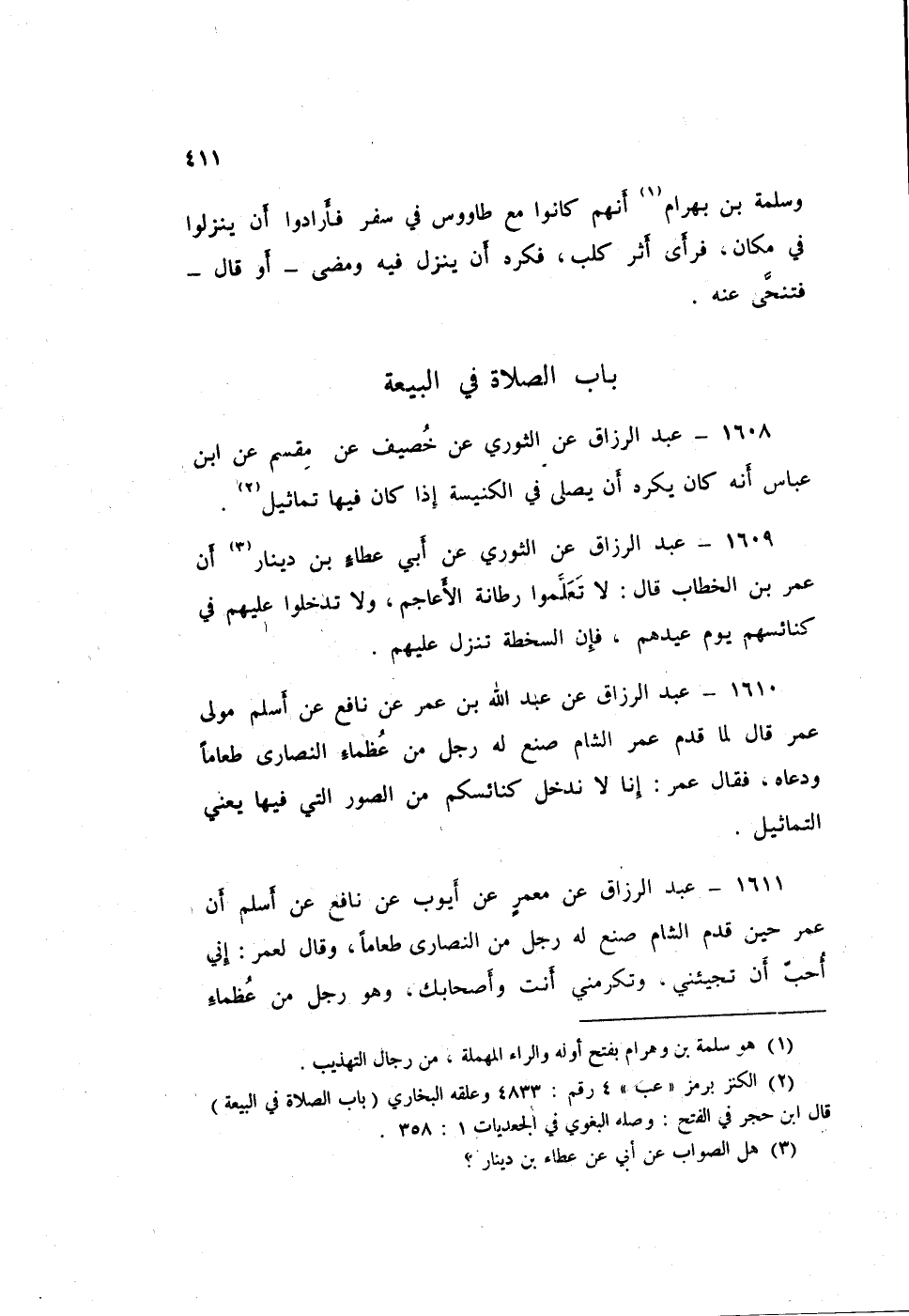 ١٦١١ - عَبْدُ الرَّزَّاقِ، عَنْ مَعْمَرٍ، عَنْ أَيُّوبَ، عَنْ نَافِعٍ، عَنْ أَسْلَمَ، أَنَّ عُمَرَ حِينَ قَدِمَ الشَّامَ صَنَعَ لَهُ رَجُلٌ مِنَ النَّصَارَى طَعَامًا، وَقَالَ لِعُمَرَ: إِنِّي أُحِبُّ أَنْ تَجِيئَنِي، وَتُكْرِمَنِي أَنْتَ وَأَصْحَابُكَ وَهُوَ رَجُلٌ مِنْ عُظَمَاءِ النَّصَارَى، فَقَالَ عُمَرُ: «إِنَّا لَا نَدْخُلُ كَنَائِسَكُمْ مِنْ أَجْلِ الصُّوَرِ الَّتِي فِيهَا» - يَعْنِي التَّمَاثِيلَ -