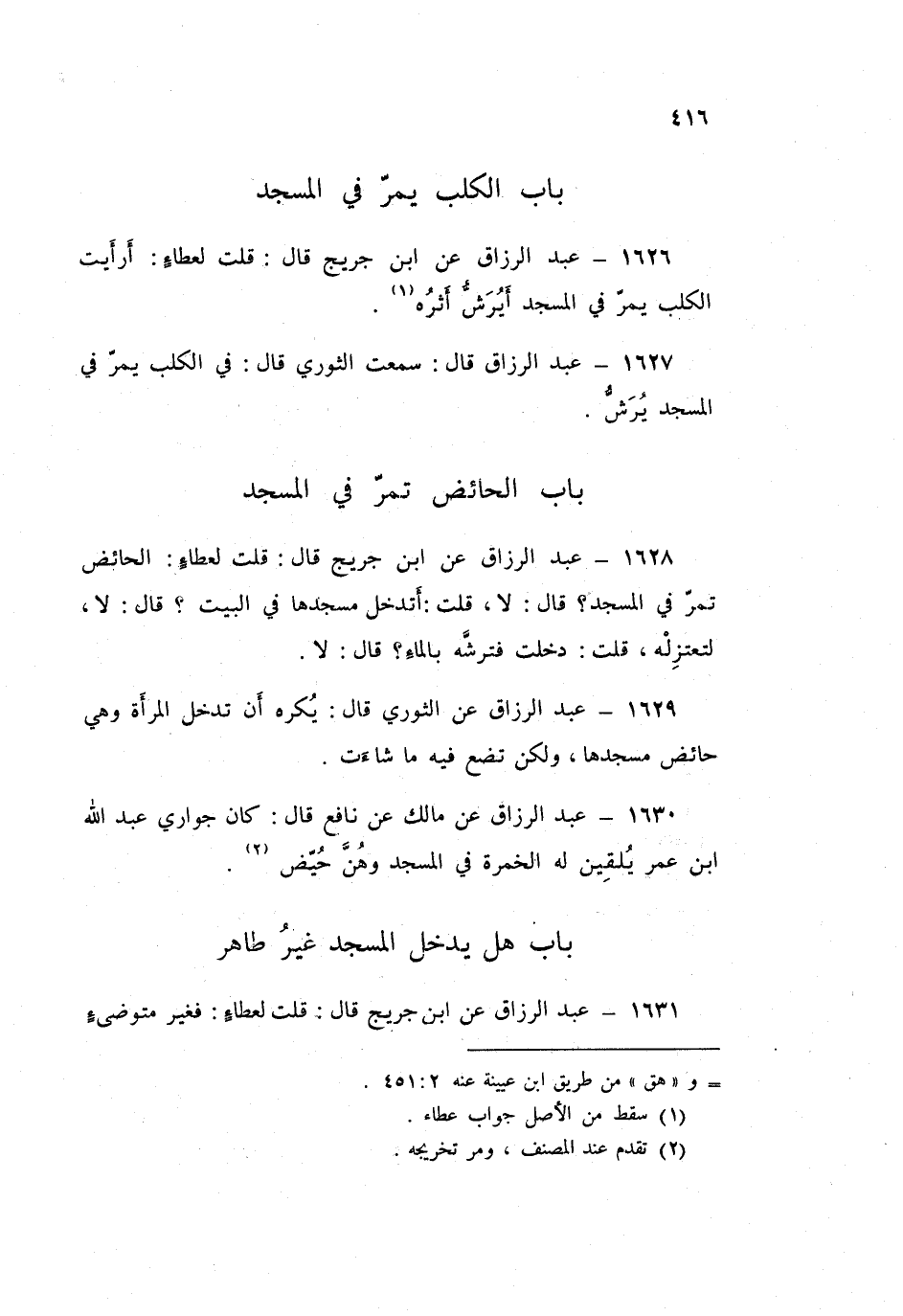 ١٦٣١ - عَبْدُ الرَّزَّاقِ، عَنِ ابْنِ جُرَيْجٍ قَالَ: قُلْتُ لِعَطَاءٍ: فَغَيْرُ مُتَوَضِّئٍ أَيَمُرُّ فِي الْمَسْجِدِ؟ قَالَ: «لَا يَضُرُّهُ»