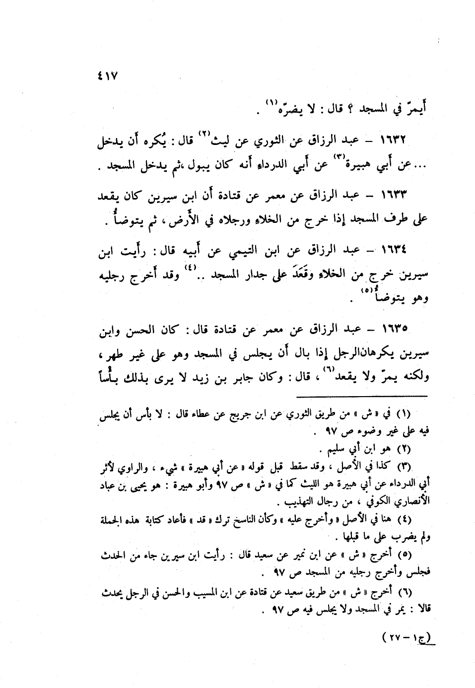 ١٦٣٥ - عَبْدُ الرَّزَّاقِ، عَنْ مَعْمَرٍ، عَنْ قَتَادَةَ قَالَ: كَانَ الْحَسَنُ، وَابْنُ سِيرِينَ، «يَكْرَهَانِ الرَّجُلَ إِذَا بَالَ أَنْ يَجْلِسَ فِي الْمَسْجِدِ، وَهُوَ عَلَى غَيْرِ طُهْرٍ، وَلَكِنَّهُ يَمُرُّ، وَلَا يَقْعُدُ». قَالَ: وَكَانَ جَابِرُ بْنُ زَيْدٍ «لَا يَرَى بِذَلِكَ بَأْسًا أَنْ يَقْعُدَ فِيهِ، وَهُوَ عَلَى غَيْرِ وُضُوءٍ»