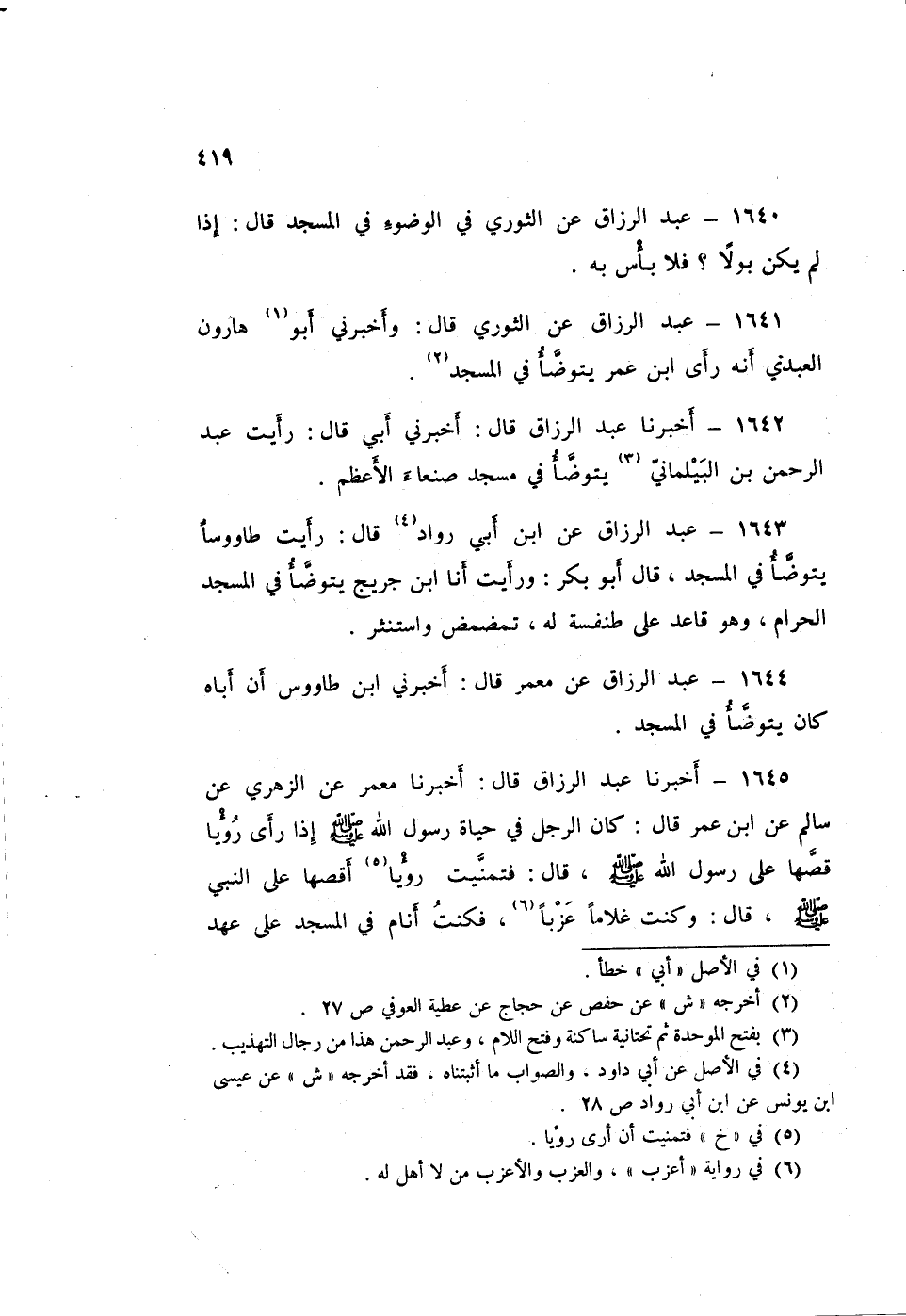 ١٦٤٣ - عَبْدُ الرَّزَّاقِ، عَنِ ابْنِ أَبِي رَوَّادٍ قَالَ: رَأَيْتُ طَاوُسًا، «يَتَوَضَّأُ فِي الْمَسْجِدِ». قَالَ أَبُو بَكْرٍ: وَرَأَيْتُ أَنَا ابْنَ جُرَيْجٍ يَتَوَضَّأُ فِي الْمَسْجِدِ الْحَرَامِ وَهُوَ قَاعِدٌ عَلَى طَنْفَسَةٍ لَهُ تَمَضْمَضَ وَاسْتَنْثَرَ "