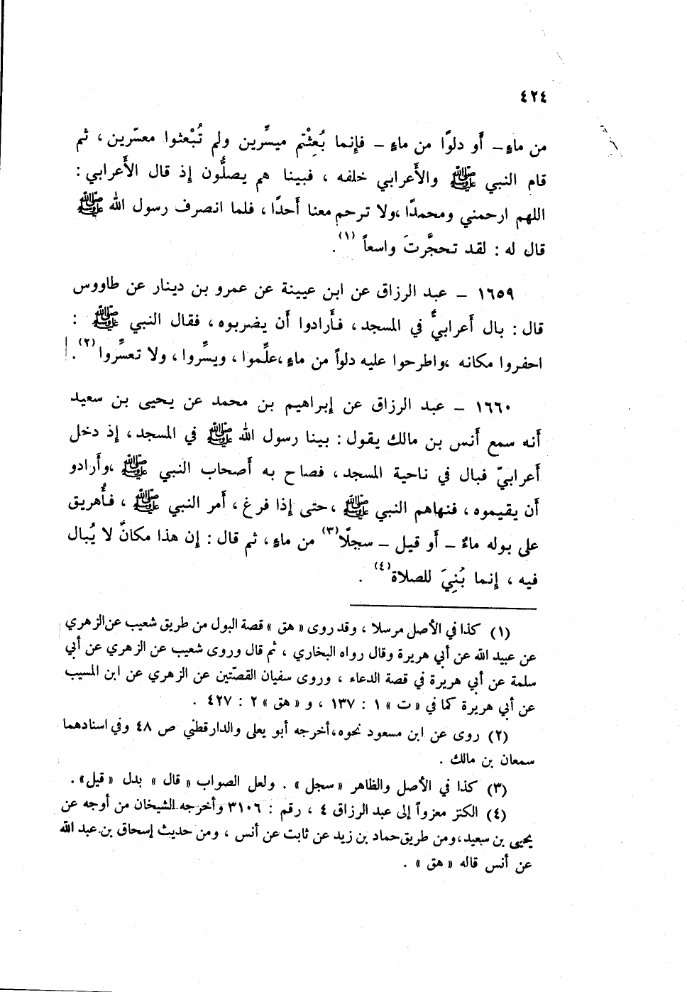 ١٦٦٠ - عَبْدُ الرَّزَّاقِ، عَنْ إِبْرَاهِيمَ بْنِ مُحَمَّدٍ، عَنْ يَحْيَى بْنِ سَعِيدٍ، أَنَّهُ سَمِعَ أَنَسَ بْنَ مَالِكٍ يَقُولُ: بَيْنَا رَسُولُ اللَّهِ صَلَّى اللهُ عَلَيْهِ وَسَلَّمَ فِي الْمَسْجِدِ إِذْ دَخَلَ أَعْرَابِيٌّ فَبَالَ فِي نَاحِيَةِ الْمَسْجِدِ فَصَاحَ بِهِ أَصْحَابُ النَّبِيِّ صَلَّى اللهُ عَلَيْهِ وَسَلَّمَ، وَأَرَادُو أَنْ يُقِيمُوهُ فَنَهَاهُمُ النَّبِيُّ صَلَّى اللهُ عَلَيْهِ وَسَلَّمَ، حَتَّى إِذَا فَرَغَ أَمَرَ النَّبِيُّ صَلَّى اللهُ عَلَيْهِ وَسَلَّمَ فَأُهْرِيقَ عَلَى بَوْلِهِ مَاءٌ، أَوْ قِيلَ سِجِلًّا مِنْ مَاءٍ، ثُمَّ قَالَ: «إِنَّ هَذَا مَكَانٌ لَا يُبَالُ فِيهِ إِنَّمَا بُنِيَ لِلصَّلَاةِ»