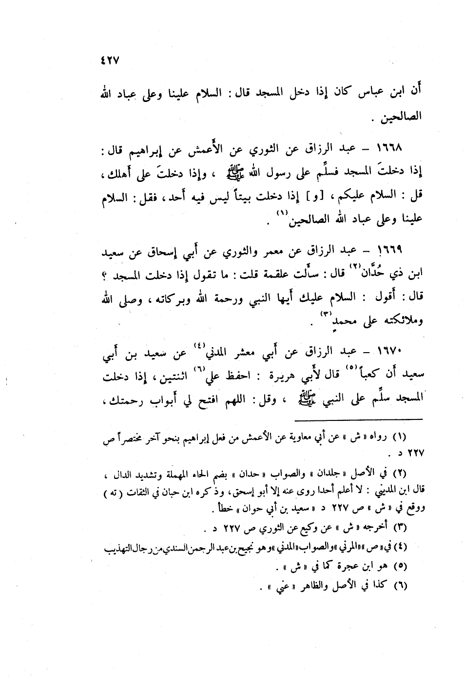 ١٦٦٩ - عَبْدُ الرَّزَّاقِ، عَنْ مَعْمَرٍ، وَالثَّوْرِيِّ، عَنْ أَبِي إِسْحَاقَ، عَنْ سَعِيدِ بْنِ ذِي حُدَّانَ قَالَ: سَأَلْتُ عَلْقَمَةَ، قُلْتُ: مَا تَقُولُ إِذَا دَخَلْتَ الْمَسْجِدَ قَالَ: «أَقُولُ السَّلَامُ عَلَيْكَ أَيُّهَا النَّبِيُّ وَرَحْمَةُ اللَّهِ وَبَرَكَاتُهُ وَصَلَّى اللَّهُ، وَمَلَائِكَتُهُ عَلَى مُحَمَّدٍ»