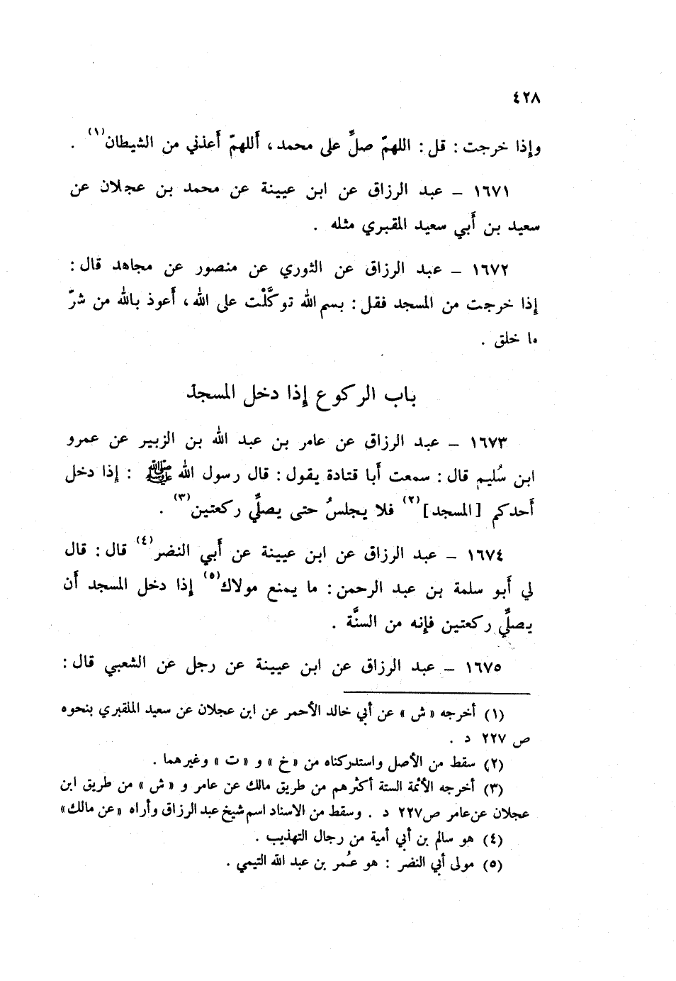١٦٧٤ - عَبْدُ الرَّزَّاقِ، عَنِ ابْنِ عُيَيْنَةَ، عَنْ أَبِي النَّضْرِ قَالَ: قَالَ لِي أَبُو سَلَمَةَ بْنُ عَبْدِ الرَّحْمَنِ: «مَا يَمْنَعُ مَوْلَاكَ إِذَا دَخَلَ الْمَسْجِدَ أَنْ يُصَلِّيَ رَكْعَتَيْنِ فَإِنَّهُ مِنَ السُّنَّةِ»