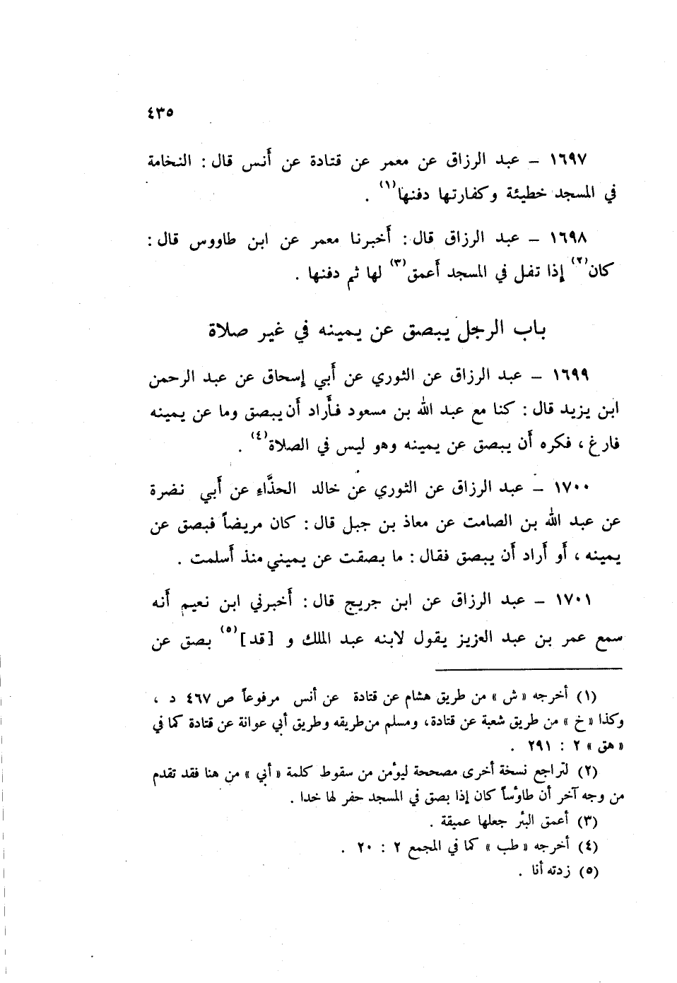 ١٦٩٨ - عَبْدُ الرَّزَّاقِ قَالَ: أَخْبَرَنَا مَعْمَرٌ، عَنِ ابْنِ طَاوُسٍ قَالَ: «كَانَ إِذَا تَفَلَ فِي الْمَسْجِدِ أَعْمَقَ لَهَا، ثُمَّ دَفَنَهَا»