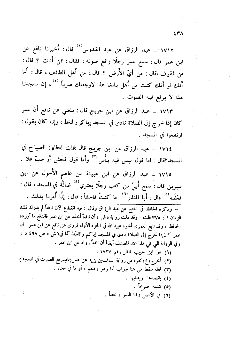 ١٧١٢ - عَبْدُ الرَّزَّاقِ، عَنْ عَبْدِ الْقُدُّوسِ قَالَ: أَخْبَرَنَا نَافِعٌ، عَنِ ابْنِ عُمَرَ قَالَ: سَمِعَ عُمَرُ رَجُلًا رَفَعَ صَوْتَهُ فَقَالَ: «مِمَّنْ أَنْتَ؟» قَالَ: مِنْ ثَقِيفٍ قَالَ: «مِنْ أَيِّ الْأَرْضِ؟» قَالَ: مِنْ أَهْلِ الطَّائِفِ قَالَ: «أَمَا أَنَّكَ لَوْ أَنَّكَ كُنْتَ مِنْ أَهْلِ بَلَدِنَا هَذَا لَأَوْجَعْتُكَ ضَرْبًا، إِنَّ مَسْجِدَنَا هَذَا لَا يُرْفَعُ فِيهِ الصَّوْتُ»