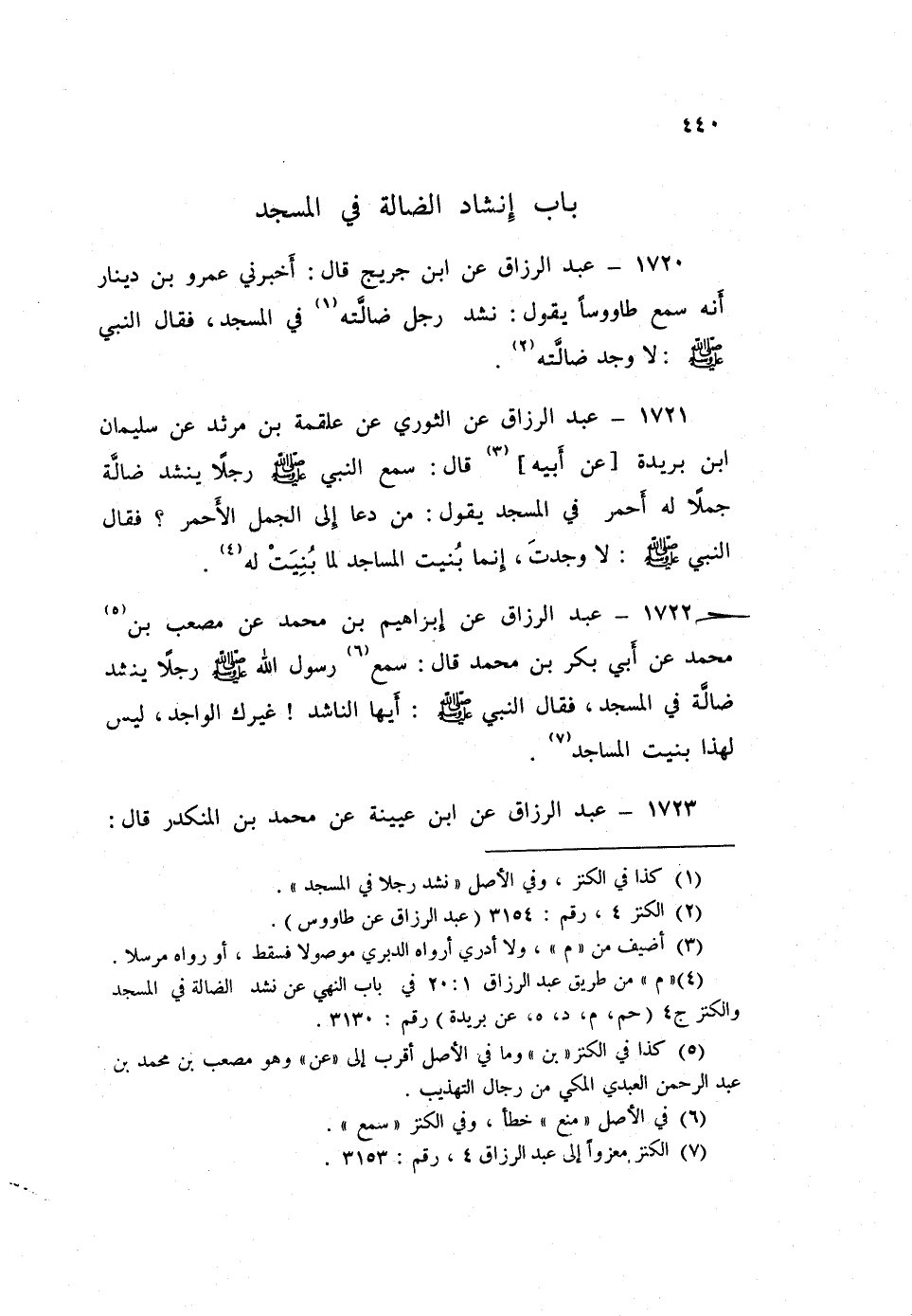 ١٧٢٠ - عَبْدُ الرَّزَّاقِ، عَنِ ابْنِ جُرَيْجٍ قَالَ: أَخْبَرَنِي عَمْرُو بْنُ دِينَارٍ، أَنَّهُ: سَمِعَ طَاوُسًا يَقُولُ: نَشَدَ رَجُلٌ ضَالَّتَهُ فِي الْمَسْجِدِ، فَقَالَ النَّبِيُّ صَلَّى اللهُ عَلَيْهِ وَسَلَّمَ: «لَا وَجَدَ ضَالَّتَهُ»