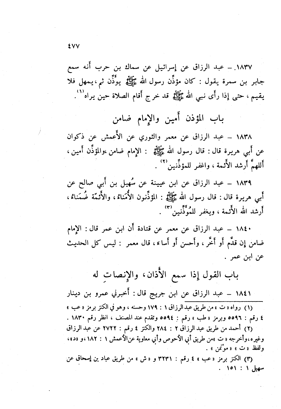 ١٨٣٩ - عَبْدُ الرَّزَّاقِ، عَنِ ابْنِ عُيَيْنَةَ، عَنْ سُهَيْلِ بْنِ أَبِي صَالِحٍ، عَنْ أَبِي هُرَيْرَةَ قَالَ: قَالَ رَسُولُ اللَّهِ صَلَّى اللهُ عَلَيْهِ وَسَلَّمَ: «الْمُؤَذِّنُونَ الْأُمَنَاءُ، وَالْأَئِمَّةُ ضُمَنَاءُ أَرْشَدَ اللَّهُ الْأَئِمَّةَ، وَيَغْفِرُ لِلْمُؤَذِّنِينَ»