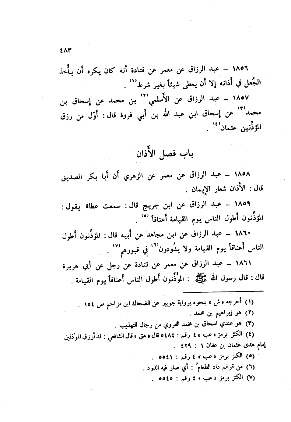 ١٨٦١ - عَبْدُ الرَّزَّاقِ، عَنْ مَعْمَرٍ، عَنْ قَتَادَةَ، عَنْ رَجُلٍ، عَنْ أَبِي هُرَيْرَةَ قَالَ: قَالَ رَسُولُ اللَّهِ صَلَّى اللهُ عَلَيْهِ وَسَلَّمَ: «الْمُؤَذِّنُونَ أَطْوَلُ النَّاسِ أَعْنَاقًا يَوْمَ الْقِيَامَةِ»