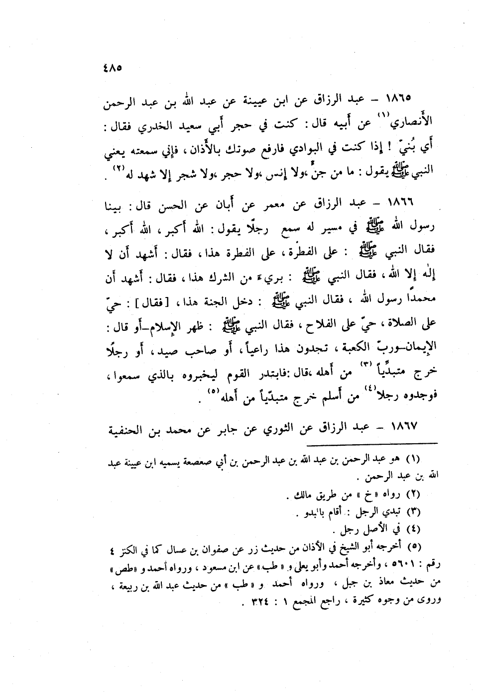 ١٨٦٥ - عَبْدُ الرَّزَّاقِ، عَنِ ابْنِ عُيَيْنَةَ، عَنْ عَبْدِ اللَّهِ بْنِ عَبْدِ الرَّحْمَنِ الْأَنْصَارِيِّ، عَنْ أَبِيهِ قَالَ: كُنْتُ فِي حِجْرِ أَبِي سَعِيدٍ الْخُدْرِيِّ فَقَالَ: أيْ بُنَيَّ إِذَا كُنْتَ فِي الْبَوَادِي فَارْفَعْ صَوْتَكَ بِالْأَذَانِ فَإِنِّي سَمِعْتُهُ، - يَعْنِي النَّبِيَّ صَلَّى اللهُ عَلَيْهِ وَسَلَّمَ - يَقُولُ: «مَا مِنْ جِنٍّ، وَلَا إِنْسٍ، وَلَا حَجَرٍ، وَلَا شَجَرٍ إِلَّا شَهِدَ لَهُ»