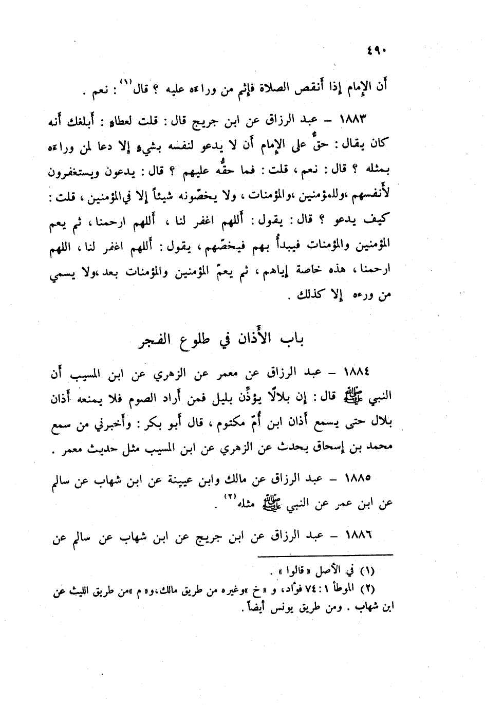 ١٨٨٦ - عَبْدُ الرَّزَّاقِ، عَنِ ابْنِ جُرَيْجٍ، عَنِ ابْنِ شِهَابٍ، عَنْ سَالِمٍ، عَنِ ابْنِ عُمَرَ، عَنِ النَّبِيِّ صَلَّى اللهُ عَلَيْهِ وَسَلَّمَ أَنَّهُ قَالَ: «إِنَّ بِلَالًا يُؤَذِّنُ بِلَيْلٍ فَكُلُوا، وَاشْرَبُوا حَتَّى تَسْمَعُوا نِدَاءَ ابْنِ أُمِّ مَكْتُومٍ»