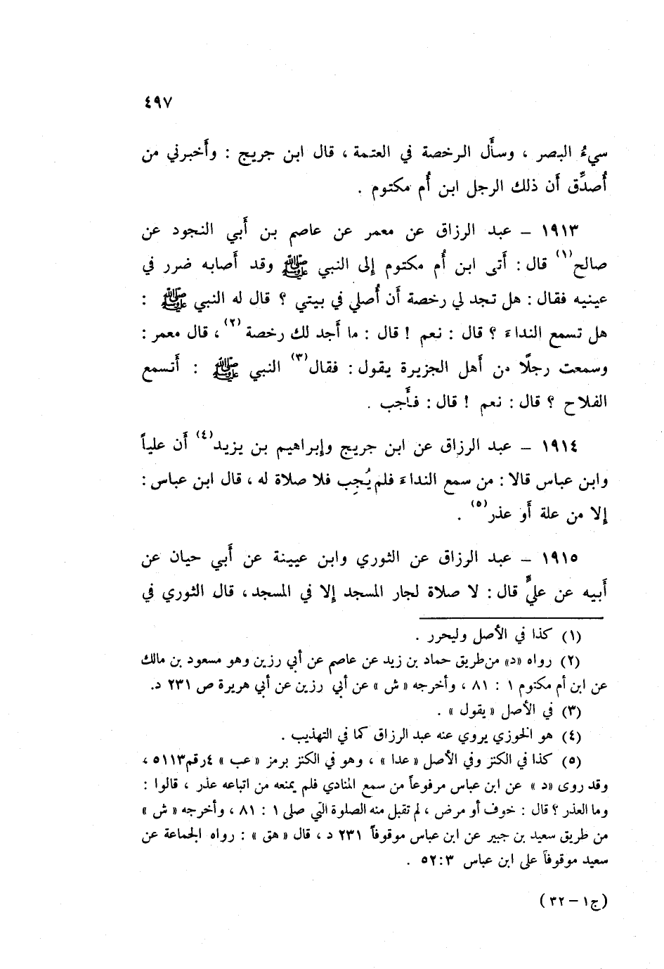 ١٩١٣ - عَبْدُ الرَّزَّاقِ، عَنْ مَعْمَرٍ، عَنْ عَاصِمِ بْنِ أَبِي النَّجُودِ، عَنْ صَالِحٍ قَالَ: أَتَى ابْنُ أُمِّ مَكْتُومٍ إِلَى النَّبِيِّ صَلَّى اللهُ عَلَيْهِ وَسَلَّمَ: وَقَدْ أَصَابَهُ ضَرَرٌ فِي عَيْنَيْهِ فَقَالَ: هَلْ تَجِدُ لِي رُخْصَةً أَنْ أُصَلِّيَ فِي بَيْتِي؟ قَالَ: لَهُ النَّبِيُّ صَلَّى اللهُ عَلَيْهِ وَسَلَّمَ: «هَلْ تَسْمَعُ النِّدَاءَ؟» قَالَ: نَعَمْ قَالَ: «مَا أَجِدُ لَكَ رُخْصَةً». قَالَ مَعْمَرٌ: وَسَمِعْتُ رَجُلًا مِنْ أَهْلِ الْجَزِيرَةِ يَقُولُ: فَقَالَ النَّبِيُّ صَلَّى اللهُ عَلَيْهِ وَسَلَّمَ: «أَتَسْمَعُ الْفَلَاحَ؟» قَالَ: نَعَمْ قَالَ: «فَأَجِبْ»
