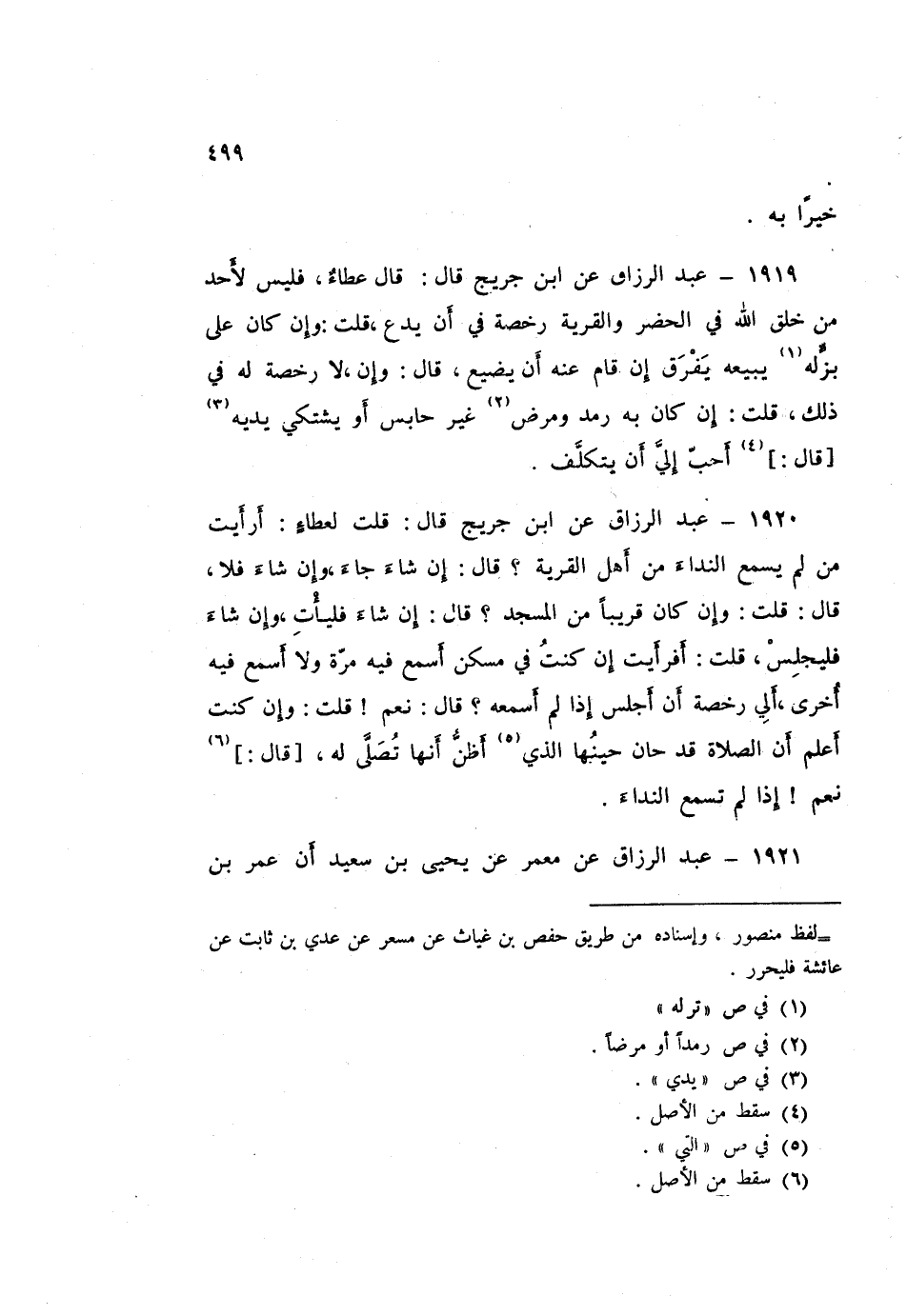 ١٩٢١ - عَبْدُ الرَّزَّاقِ، عَنْ مَعْمَرٍ، عَنْ يَحْيَى بْنِ سَعِيدٍ، أَنَّ عُمَرَ بْنَ الْخَطَّابِ، فَقَدَ رِجْلًا أَيَّامًا فَإِمَّا دَخَلَ عَلَيْهِ وَإِمَّا لَقِيَهُ قَالَ: «مِنْ أَيْنَ تَرَى؟» قَالَ: اشْتَكَيْتُ فَمَا خَرَجْتُ لِصَلَاةٍ، وَلَا لِغَيْرِهَا، فَقَالَ عُمَرُ: «إِنْ كُنْتُ مُجِيبًا شَيْئًا فَأَجِبِ الْفَلَاحَ»