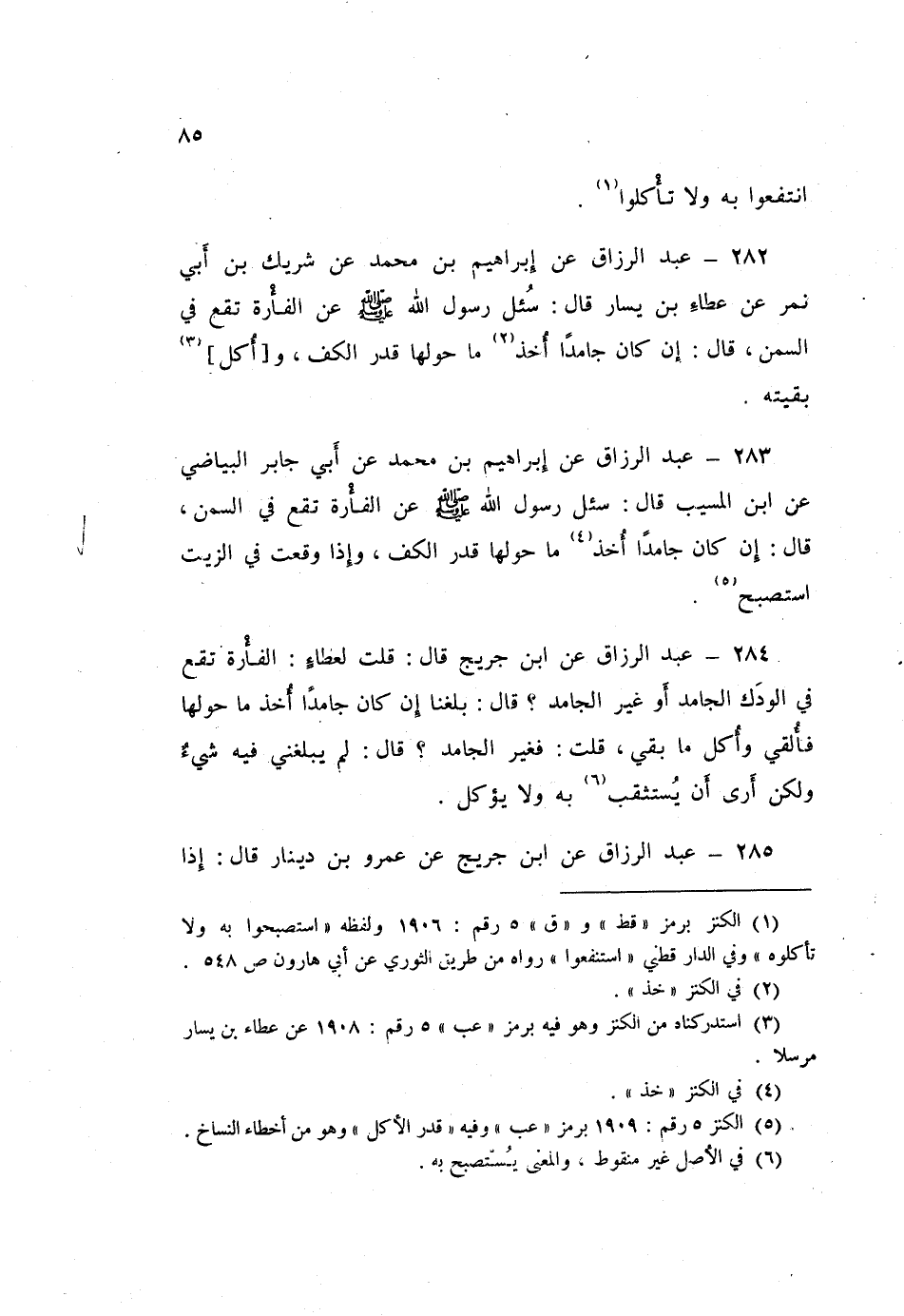 ٢٨٢ - عَبْدُ الرَّزَّاقِ، عَنْ إِبْرَاهِيمَ بْنِ مُحَمَّدٍ، عَنْ شَرِيكِ بْنِ أَبِي نَمِرٍ، عَنْ عَطَاءِ بْنِ يَسَارٍ قَالَ: سُئِلَ رَسُولُ اللَّهِ صَلَّى اللهُ عَلَيْهِ وَسَلَّمَ عَنِ الْفَأْرَةِ تَقَعُ فِي السَّمْنِ قَالَ: «إِنْ كَانَ جَامِدًا أُخِذَ مَا حَوْلَهَا قَدْرَ الْكَفِّ وَأُكِلَ بَقِيَّتُهُ»