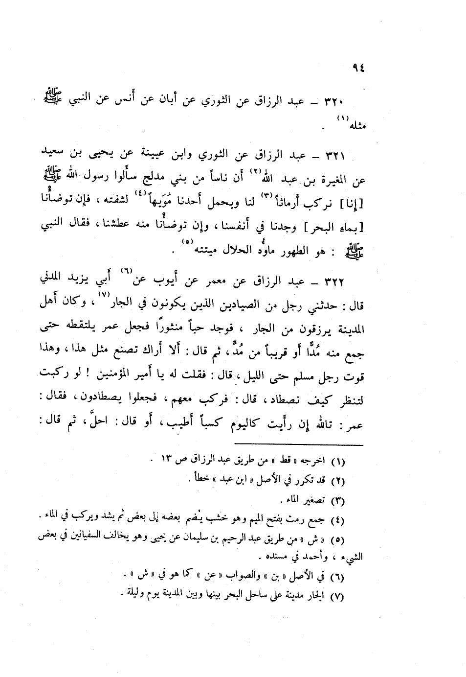 ٣٢١ - عَبْدُ الرَّزَّاقِ، عَنِ الثَّوْرِيِّ، وَابْنِ عُيَيْنَةَ، عَنْ يَحْيَى بْنِ سَعِيدٍ، عَنِ الْمُغِيرَةِ بْنِ عَبْدِ اللَّهِ، أَنَّ نَاسًا مِنْ بَنِي مُدْلِجٍ سَأَلُوا رَسُولَ اللَّهِ صَلَّى اللهُ عَلَيْهِ وَسَلَّمَ، إِنَّا نَرْكَبُ أَرْمَاثًا لَنَا، وَيَحْمِلُ أَحَدُنَا مُوَيْهًا لِشِفَّتِهِ، فَإِنْ تَوَضَّأْنَا بِمَاءِ الْبَحْرِ وَجَدْنَا فِي أَنْفُسِنَا، وَإِنْ تَوَضَّأْنَا مِنْهُ عَطِشْنَا، فَقَالَ النَّبِيُّ صَلَّى اللهُ عَلَيْهِ وَسَلَّمَ: «هُوَ الطَّهُورُ مَاؤُهُ الْحَلَالُ مَيْتَتُهُ»