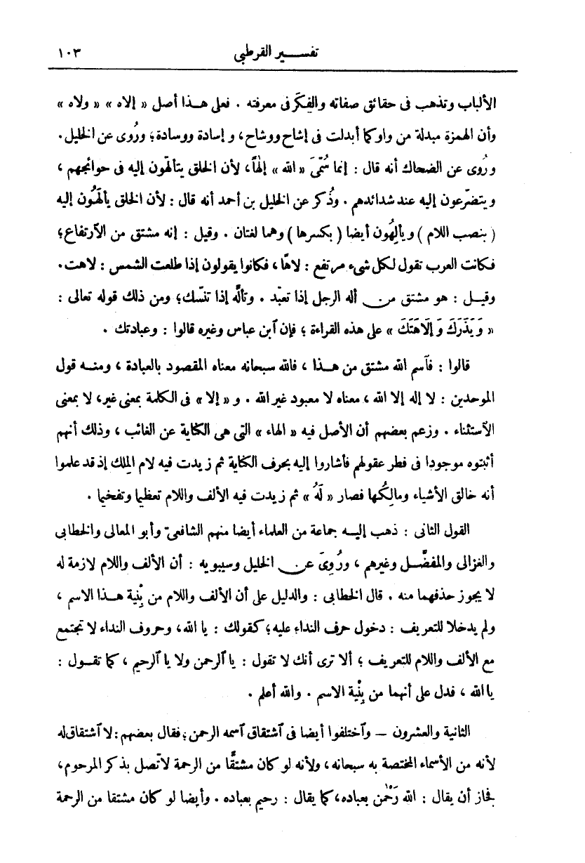 الْأَلْبَابُ وَتَذْهَبُ فِي حَقَائِقِ صِفَاتِهِ وَالْفِكْرِ فِي مَعْرِفَتِهِ. فَعَلَى هَذَا أَصْلُ" إِلَاهٍ"" وَلَاهٌ" وَأَنَّ الْهَمْزَةَ مُبْدَلَةٌ مِنْ وَاوٍ كَمَا أُبْدِلَتْ فِي إِشَاحٍ وَوِشَاحٍ، وَإِسَادَةٍ وَوِسَادَةٍ، وَرُوِيَ عَنِ الْخَلِيلِ. وَرُوِيَ عَنِ الضَّحَّاكِ أَنَّهُ قَالَ: إِنَّمَا سُمِّيَ" اللَّهُ" إِلَهًا لِأَنَّ الْخَلْقَ يَتَأَلَّهُونَ إِلَيْهِ فِي حَوَائِجِهِمْ، وَيَتَضَرَّعُونَ إِلَيْهِ عِنْدَ شَدَائِدِهِمْ. وَذُكِرَ عَنِ الْخَلِيلِ بْنِ أَحْمَدَ أَنَّهُ قَالَ: لِأَنَّ الْخَلْقَ يَأْلَهُونَ إِلَيْهِ (بِنَصْبِ اللَّامِ) وَيَأْلِهُونَ أَيْضًا (بِكَسْرِهَا) وَهُمَا لُغَتَانِ. وَقِيلَ إِنَّهُ مُشْتَقٌّ مِنَ الِارْتِفَاعِ، فكانت العرب تقول لكل شي مُرْتَفِعٍ: لَاهًا فَكَانُوا يَقُولُونَ إِذَا طَلَعَتِ الشَّمْسُ: لَاهَتْ. وَقِيلَ: هُوَ مُشْتَقٌّ مِنْ أَلِهَ الرَّجُلُ إِذَا تَنَسَّكَ، وَمِنْ ذَلِكَ قَوْلُهُ تَعَالَى:" وَيَذَرَكَ وَإِلَاهَتَكَ" عَلَى هَذِهِ الْقِرَاءَةِ، فَإِنَّ ابْنَ عَبَّاسٍ وَغَيْرَهُ قَالُوا: وَعِبَادَتَكَ. قَالُوا: فَاسْمُ اللَّهِ مُشْتَقٌّ مِنْ هَذَا، فَاللَّهُ سُبْحَانَهُ مَعْنَاهُ الْمَقْصُودُ بِالْعِبَادَةِ، وَمِنْهُ قَوْلُ الْمُوَحِّدِينَ: لَا إِلَهَ إِلَّا اللَّهُ، مَعْنَاهُ لَا مَعْبُودَ غَيْرُ اللَّهِ. وَ" إِلَّا" فِي الْكَلِمَةِ بِمَعْنَى غَيْرِ، لَا بِمَعْنَى الِاسْتِثْنَاءِ. وَزَعَمَ بَعْضُهُمْ أَنَّ الْأَصْلَ فِيهِ" الْهَاءُ" الَّتِي هِيَ الْكِنَايَةُ عَنِ الْغَائِبِ، وَذَلِكَ أَنَّهُمْ أَثْبَتُوهُ موجدا فِي فِطَرِ عُقُولِهِمْ فَأَشَارُوا إِلَيْهِ بِحَرْفِ الْكِنَايَةِ ثُمَّ زِيدَتْ فِيهِ لَامُ الْمِلْكِ إِذْ قَدْ عَلِمُوا أَنَّهُ خَالِقُ الْأَشْيَاءِ وَمَالِكُهَا فَصَارَ" لَهُ" ثُمَّ زِيدَتْ فِيهِ الْأَلِفُ وَاللَّامُ تَعْظِيمًا وَتَفْخِيمًا. الْقَوْلُ الثَّانِي: ذَهَبَ إِلَيْهِ جَمَاعَةٌ مِنَ الْعُلَمَاءِ أَيْضًا مِنْهُمُ الشَّافِعِيُّ وَأَبُو الْمَعَالِي وَالْخَطَّابِيُّ وَالْغَزَالِيُّ وَالْمُفَضَّلُ وَغَيْرُهُمْ، وَرُوِيَ عَنِ الْخَلِيلِ وَسِيبَوَيْهِ: أَنَّ الألف واللام لازمة له لا يجوز حذفها مِنْهُ. قَالَ الْخَطَّابِيُّ: وَالدَّلِيلُ عَلَى أَنَّ الْأَلِفَ وَاللَّامَ مِنْ بِنْيَةِ هَذَا الِاسْمِ، وَلَمْ يَدْخُلَا لِلتَّعْرِيفِ، أَلَّا تَرَى أَنَّكَ لَا تَقُولُ: يَا الرَّحْمَنُ وَلَا يَا الرَّحِيمُ، كَمَا تَقُولُ: يَا لله، فَدَلَّ عَلَى أَنَّهُمَا مِنْ بِنْيَةِ الِاسْمِ. وَاللَّهُ أَعْلَمُ. الثَّانِيَةُ وَالْعِشْرُونَ وَاخْتَلَفُوا أَيْضًا فِي اشْتِقَاقِ اسمه الرحمن، فقال بعضهم: لااشتقاق لَهُ لِأَنَّهُ مِنَ الْأَسْمَاءِ الْمُخْتَصَّةِ بِهِ سُبْحَانَهُ، ولأنه لو كان مشتقا من الرحمة لا تصل بذكر المرحوم، فحاز أن يقال: الله رحمان بِعِبَادِهِ، كَمَا يُقَالُ: رَحِيمٌ بِعِبَادِهِ. وَأَيْضًا لَوْ كَانَ مُشْتَقًّا مِنَ الرَّحْمَةِ