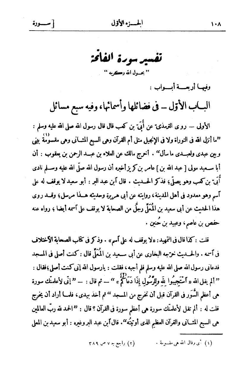 الْأُولَى: رَوَى التِّرْمِذِيُّ عَنْ أُبَيِّ بْنِ كَعْبٍ قَالَ قَالَ رَسُولَ اللَّهِ صَلَّى اللَّهُ عَلَيْهِ وَسَلَّمَ: (مَا أَنْزَلَ اللَّهُ فِي التَّوْرَاةِ وَلَا فِي الْإِنْجِيلِ مِثْلَ أُمِّ الْقُرْآنِ وَهِيَ السَّبْعُ الْمَثَانِي وَهِيَ مَقْسُومَةٌ «١» بَيْنِي وَبَيْنَ عَبْدِي وَلِعَبْدِي مَا سَأَلَ (. أَخْرَجَ مَالِكٌ عَنِ الْعَلَاءِ بْنِ عَبْدِ الرَّحْمَنِ بْنِ يَعْقُوبَ: أَنَّ أَبَا سَعِيدٍ مَوْلَى [عَبْدِ اللَّهِ بْنِ] عَامِرِ بْنِ كُرَيْزٍ أَخْبَرَهُ أَنَّ رَسُولَ اللَّهِ صَلَّى اللَّهُ عَلَيْهِ سلم نَادَى أُبَيَّ بْنَ كَعْبٍ وَهُوَ يُصَلِّي، فَذَكَرَ الْحَدِيثَ. قَالَ ابْنُ عَبْدِ الْبَرِّ: أَبُو سَعِيدٍ لَا يُوقَفُ لَهُ عَلَى اسْمٍ وَهُوَ مَعْدُودٌ فِي أَهْلِ الْمَدِينَةِ، رِوَايَتُهُ عَنْ أَبِي هُرَيْرَةَ وَحَدِيثُهُ هَذَا مُرْسَلٌ، وَقَدْ رَوَى هَذَا الْحَدِيثَ عَنْ أَبِي سَعِيدِ بْنِ الْمُعَلَّى رَجُلٌ مِنَ الصَّحَابَةِ لَا يُوقَفُ عَلَى اسْمِهِ أَيْضًا، رَوَاهُ عَنْهُ حَفْصُ بْنُ عَاصِمٍ، وَعُبَيْدُ بْنُ حُنَيْنٍ. قُلْتُ: كَذَا قَالَ فِي التَّمْهِيدِ: (لَا يُوقَفُ لَهُ عَلَى اسْمٍ). وَذَكَرَ فِي كِتَابِ الصَّحَابَةِ الِاخْتِلَافَ فِي اسْمِهِ. وَالْحَدِيثُ خَرَّجَهُ الْبُخَارِيُّ عَنْ أَبِي سَعِيدِ بْنِ الْمُعَلَّى قَالَ: كُنْتُ أُصَلِّي فِي الْمَسْجِدِ فَدَعَانِي رَسُولُ اللَّهِ صَلَّى اللَّهُ عَلَيْهِ وَسَلَّمَ فَلَمْ أُجِبْهُ، فَقُلْتُ: يَا رَسُولَ اللَّهِ إِنِّي كُنْتُ أُصَلِّي، فَقَالَ: (أَلَمْ يَقُلِ اللَّهُ" اسْتَجِيبُوا لِلَّهِ وَلِلرَّسُولِ إِذا دَعاكُمْ «٢» ثُمَّ قال) إِنِّي لَأُعَلِّمَنَّكَ سُورَةً هِيَ أَعْظَمُ السُّوَرِ فِي الْقُرْآنِ قَبْلَ أَنْ تَخْرُجَ مِنَ الْمَسْجِدِ ثُمَّ أَخَذَ بِيَدِي، فَلَمَّا أَرَادَ أَنْ يَخْرُجَ قُلْتُ لَهُ: أَلَمْ تَقُلْ لَأُعَلِّمَنَّكَ سُورَةً هِيَ أَعْظَمُ سُورَةٍ فِي الْقُرْآنِ؟ قَالَ: (الْحَمْدُ لِلَّهِ رَبِّ الْعالَمِينَ هِيَ السَّبْعُ الْمَثَانِي وَالْقُرْآنُ الْعَظِيمُ الَّذِي أُوتِيتُهُ). قَالَ ابْنُ عَبْدِ الْبَرِّ وَغَيْرُهُ: أَبُو سعيد بن المعلى