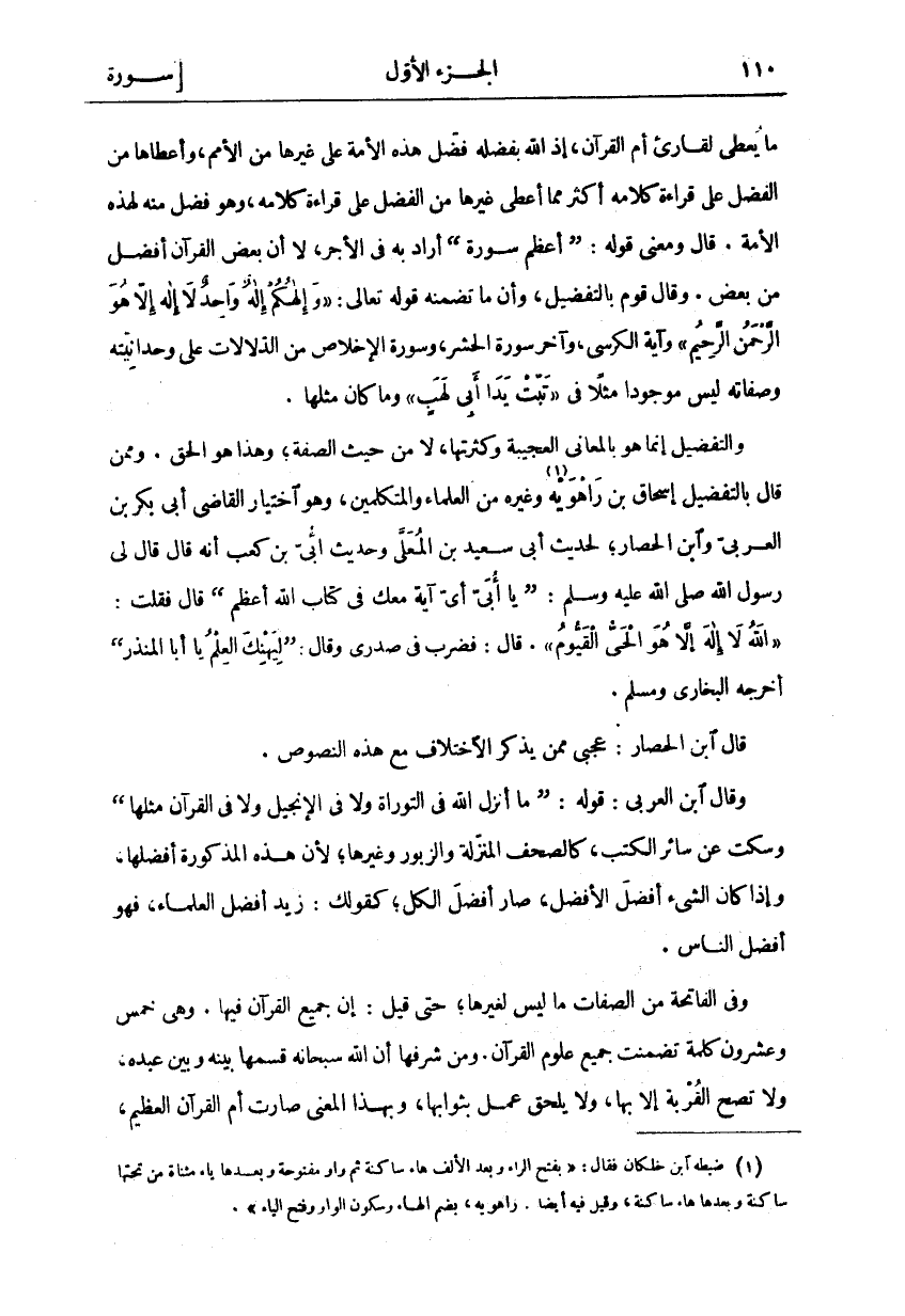 مَا يُعْطِي لِقَارِئِ أُمِّ الْقُرْآنِ، إِذِ اللَّهُ بِفَضْلِهِ فَضَّلَ هَذِهِ الْأُمَّةَ عَلَى غَيْرِهَا مِنَ الْأُمَمِ، وَأَعْطَاهَا مِنَ الْفَضْلِ عَلَى قِرَاءَةِ كَلَامِهِ أَكْثَرَ مِمَّا أَعْطَى غَيْرَهَا مِنَ الْفَضْلِ عَلَى قِرَاءَةِ كَلَامِهِ، وَهُوَ فَضْلٌ مِنْهُ لِهَذِهِ الْأُمَّةِ. قَالَ وَمَعْنَى قَوْلِهِ: (أَعْظَمُ سُورَةٍ) أَرَادَ بِهِ فِي الْأَجْرِ، لَا أَنَّ بَعْضَ الْقُرْآنِ أَفْضَلُ مِنْ بَعْضٍ. وَقَالَ قَوْمٌ بِالتَّفْضِيلِ، وَأَنَّ مَا تَضَمَّنَهُ قَوْلُهُ تَعَالَى" وَإِلهُكُمْ إِلهٌ واحِدٌ لَا إِلهَ إِلَّا هُوَ الرَّحْمنُ الرَّحِيمُ" [البقرة: ١٦٣] وَآيَةُ الْكُرْسِيِّ، وَآخِرُ سُورَةِ الْحَشْرِ، وَسُورَةُ الْإِخْلَاصِ مِنَ الدَّلَالَاتِ عَلَى وَحْدَانِيَّتِهِ وَصِفَاتِهِ لَيْسَ مَوْجُودًا مثلا في" تَبَّتْ يَدا أَبِي لَهَبٍ" [المسد: ١] وَمَا كَانَ مِثْلَهَا. وَالتَّفْضِيلُ إِنَّمَا هُوَ بِالْمَعَانِي الْعَجِيبَةِ وَكَثْرَتِهَا، لَا مِنْ حَيْثُ الصِّفَةِ، وَهَذَا هُوَ الْحَقُّ. وَمِمَّنْ قَالَ بِالتَّفْضِيلِ إِسْحَاقُ بْنُ رَاهْوَيْهِ «١» وَغَيْرُهُ مِنَ الْعُلَمَاءِ وَالْمُتَكَلِّمِينَ، وَهُوَ اخْتِيَارُ الْقَاضِي أَبِي بَكْرِ بْنِ الْعَرَبِيِّ وَابْنِ الْحَصَّارِ، لِحَدِيثِ أَبِي سَعِيدِ بْنِ الْمُعَلَّى وَحَدِيثِ أُبَيِّ بْنِ كَعْبٍ أَنَّهُ قَالَ قَالَ لِي رَسُولُ اللَّهِ صَلَّى اللَّهُ عَلَيْهِ وَسَلَّمَ: (يَا أُبَيُّ أَيُّ آيَةٍ مَعَكَ فِي كِتَابِ اللَّهِ أَعْظَمُ) قال فقلت:" اللَّهُ لَا إِلهَ إِلَّا هُوَ الْحَيُّ الْقَيُّومُ" [البقرة: ٢٥٥]. قَالَ: فَضَرَبَ فِي صَدْرِي وَقَالَ: (لِيَهْنِكَ الْعِلْمُ يَا أَبَا الْمُنْذِرِ) أَخْرَجَهُ الْبُخَارِيُّ وَمُسْلِمٌ. قَالَ ابْنُ الْحَصَّارِ: عَجَبِي مِمَّنْ يَذْكُرُ الِاخْتِلَافَ مَعَ هَذِهِ النُّصُوصِ. وَقَالَ ابْنُ الْعَرَبِيِّ: قَوْلُهُ: (مَا أَنْزَلَ اللَّهُ فِي التَّوْرَاةِ وَلَا فِي الْإِنْجِيلِ وَلَا فِي الْقُرْآنِ مِثْلَهَا) وَسَكَتَ عَنْ سَائِرِ الْكُتُبِ، كَالصُّحُفِ الْمُنَزَّلَةِ وَالزَّبُورِ وَغَيْرِهَا، لِأَنَّ هَذِهِ الْمَذْكُورَةَ أَفْضَلَهَا، وَإِذَا كَانَ الشَّيْءُ أَفْضَلَ الْأَفْضَلِ، صَارَ أَفْضَلَ الْكُلِّ. كَقَوْلِكَ: زَيْدٌ أَفْضَلُ الْعُلَمَاءِ فَهُوَ أَفْضَلُ النَّاسِ. وَفِي الْفَاتِحَةِ مِنَ الصِّفَاتِ مَا لَيْسَ لِغَيْرِهَا، حَتَّى قِيلَ: إِنَّ جَمِيعَ الْقُرْآنِ فِيهَا. وَهِيَ خَمْسٌ وَعِشْرُونَ كَلِمَةً تَضَمَّنَتْ جَمِيعَ عُلُومِ الْقُرْآنِ. وَمِنْ شَرَفِهَا أَنَّ اللَّهَ سُبْحَانَهُ قَسَّمَهَا بَيْنَهُ وَبَيْنَ عَبْدِهِ، وَلَا تَصِحُّ الْقُرْبَةُ إِلَّا بِهَا، وَلَا يَلْحَقُ عَمَلٌ بِثَوَابِهَا، وَبِهَذَا المعنى صارت أم القرآن العظيم،