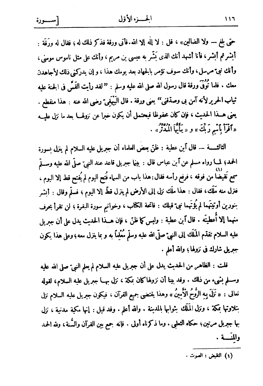 حَتَّى بَلَغَ وَلَا الضَّالِّينَ"، قُلْ: لَا إِلَهَ إِلَّا اللَّهُ. فَأَتَى وَرَقَةَ فَذَكَرَ ذَلِكَ لَهُ، فَقَالَ لَهُ وَرَقَةُ: أَبْشِرْ ثُمَّ أَبْشِرْ، فَأَنَا أشهد أنك الذي بشر به عيسى بن مَرْيَمَ، وَأَنَّكَ عَلَى مِثْلِ نَامُوسِ مُوسَى، وَأَنَّكَ نَبِيٌّ مُرْسَلٌ، وَأَنَّكَ سَوْفَ تُؤْمَرُ بِالْجِهَادِ بَعْدَ يَوْمِكَ هَذَا، وَإِنْ يُدْرِكْنِي ذَلِكَ لَأُجَاهِدَنَّ مَعَكَ. فَلَمَّا تُوُفِّيَ وَرَقَةُ قَالَ رَسُولُ اللَّهِ صَلَّى اللَّهُ عَلَيْهِ وَسَلَّمَ: (لَقَدْ رَأَيْتُ الْقَسَّ فِي الْجَنَّةِ عَلَيْهِ ثِيَابُ الْحَرِيرِ لِأَنَّهُ آمَنَ بِي وَصَدَّقَنِي) يَعْنِي وَرَقَةَ. قَالَ الْبَيْهَقِيُّ رَضِيَ اللَّهُ عَنْهُ: هَذَا مُنْقَطِعٌ. يَعْنِي هَذَا الْحَدِيثَ، فَإِنْ كَانَ مَحْفُوظًا فَيَحْتَمِلُ أَنْ يَكُونَ خَبَرًا عَنْ نزولها بعد ما نزل عليه" اقْرَأْ بِاسْمِ رَبِّكَ" [العلق: ١] و" يا أَيُّهَا الْمُدَّثِّرُ" [الْمُدَّثِّرُ: ١]. الثَّالِثَةُ: قَالَ ابْنُ عَطِيَّةَ: ظَنَّ بَعْضُ الْعُلَمَاءِ أَنَّ جِبْرِيلَ عَلَيْهِ السَّلَامُ لَمْ يَنْزِلْ بِسُورَةِ الْحَمْدِ، لِمَا رَوَاهُ مُسْلِمٌ عَنِ ابْنِ عَبَّاسٍ قَالَ: بَيْنَمَا جِبْرِيلُ قَاعِدٌ عِنْدَ النَّبِيِّ صَلَّى اللَّهُ عَلَيْهِ وَسَلَّمَ سَمِعَ نَقِيضًا «١» مِنْ فَوْقِهِ، فَرَفَعَ رَأْسَهُ فَقَالَ: هَذَا بَابٌ مِنَ السَّمَاءِ فُتِحَ الْيَوْمُ لَمْ يُفْتَحْ قَطُّ إِلَّا الْيَوْمَ، فَنَزَلَ مِنْهُ مَلَكٌ، فَقَالَ: هَذَا مَلَكٌ نَزَلَ إِلَى الْأَرْضِ لَمْ يَنْزِلْ قَطُّ إِلَّا الْيَوْمَ، فَسَلَّمَ وَقَالَ: أَبْشِرْ بِنُورَيْنِ أُوتِيتَهُمَا لَمْ يُؤْتَهُمَا نَبِيٌّ قَبْلَكَ: فَاتِحَةُ الْكِتَابِ، وَخَوَاتِيمُ سُورَةِ الْبَقَرَةِ، لَنْ تَقْرَأَ بِحَرْفٍ مِنْهُمَا إِلَّا أُعْطِيتَهُ. قَالَ ابْنُ عَطِيَّةَ: وَلَيْسَ كَمَا ظُنَّ، فَإِنَّ هَذَا الْحَدِيثَ يَدُلُّ عَلَى أَنَّ جِبْرِيلَ عَلَيْهِ السَّلَامُ تَقَدَّمَ الْمَلَكَ إِلَى النَّبِيِّ صَلَّى اللَّهُ عَلَيْهِ وَسَلَّمَ مُعْلِمًا بِهِ وَبِمَا يَنْزِلُ مَعَهُ، وَعَلَى هَذَا يَكُونُ جِبْرِيلُ شَارَكَ فِي نُزُولِهَا، وَاللَّهُ أَعْلَمُ. قُلْتُ: الظَّاهِرُ مِنَ الْحَدِيثِ يَدُلُّ عَلَى أَنَّ جِبْرِيلَ عَلَيْهِ السَّلَامُ لَمْ يُعْلِمِ النَّبِيَّ صَلَّى اللَّهُ عَلَيْهِ وَسَلَّمَ بِشَيْءٍ مِنْ ذَلِكَ. وَقَدْ بَيَّنَّا أَنَّ نُزُولَهَا كَانَ بِمَكَّةَ، نَزَلَ بِهَا جِبْرِيلُ عَلَيْهِ السَّلَامُ، لِقَوْلِهِ تَعَالَى:" نَزَلَ بِهِ الرُّوحُ الْأَمِينُ" [الشعراء: ١٩٣] وَهَذَا يَقْتَضِي جَمِيعَ الْقُرْآنِ، فَيَكُونُ جِبْرِيلُ عَلَيْهِ السَّلَامُ نَزَلَ بِتِلَاوَتِهَا بِمَكَّةَ، وَنَزَلَ الْمَلَكُ بِثَوَابِهَا بِالْمَدِينَةِ. وَاللَّهُ أَعْلَمُ. وَقَدْ قِيلَ: إِنَّهَا مَكِّيَّةٌ مَدَنِيَّةٌ، نَزَلَ بِهَا جِبْرِيلُ مَرَّتَيْنِ، حَكَاهُ الثَّعْلَبِيُّ. وَمَا ذَكَرْنَاهُ أَوْلَى. فَإِنَّهُ جَمْعٌ بَيْنَ الْقُرْآنِ والسنة، ولله الحمد والمنة.