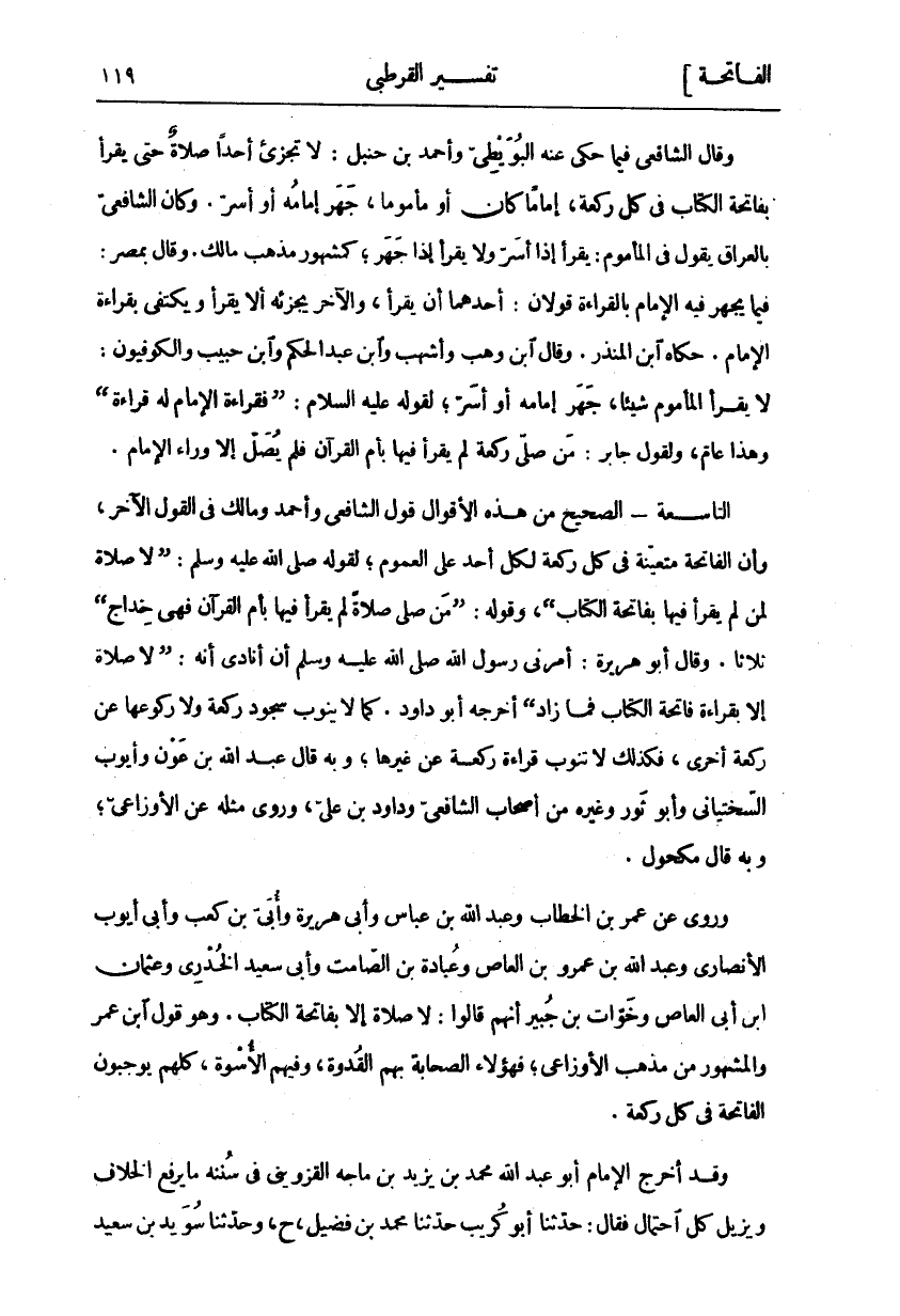 وَقَالَ الشَّافِعِيُّ فِيمَا حَكَى عَنْهُ الْبُوَيْطِيُّ وَأَحْمَدُ بْنُ حَنْبَلٍ: لَا تُجْزِئُ أَحَدًا صَلَاةٌ حَتَّى يَقْرَأَ بِفَاتِحَةِ الْكِتَابِ فِي كُلِّ رَكْعَةٍ، إِمَامًا كَانَ أَوْ مَأْمُومًا، جَهَرَ إِمَامُهُ أَوْ أَسَرَّ. وَكَانَ الشَّافِعِيُّ بِالْعِرَاقِ يَقُولُ فِي الْمَأْمُومِ: يَقْرَأُ إِذَا أَسَرَّ وَلَا يَقْرَأُ إِذَا جَهَرَ، كَمَشْهُورِ مَذْهَبِ مَالِكٍ. وَقَالَ بِمِصْرَ: فِيمَا يَجْهَرُ فِيهِ الْإِمَامُ بِالْقِرَاءَةِ قَوْلَانِ: أَحَدُهُمَا أَنْ يَقْرَأَ وَالْآخَرُ يُجْزِئُهُ أَلَّا يَقْرَأَ وَيَكْتَفِيَ بِقِرَاءَةِ الْإِمَامِ. حَكَاهُ ابْنُ الْمُنْذِرِ. وَقَالَ ابْنُ وَهْبٍ وَأَشْهَبُ وَابْنُ عَبْدِ الْحَكَمِ وَابْنُ حَبِيبٍ وَالْكُوفِيُّونَ: لَا يَقْرَأُ الْمَأْمُومُ شَيْئًا، جَهَرَ إِمَامُهُ أَوْ أَسَرَّ، لِقَوْلِهِ عَلَيْهِ السَّلَامُ: (فَقِرَاءَةُ الْإِمَامِ لَهُ قِرَاءَةٌ) وَهَذَا عَامٌّ، وَلِقَوْلِ جَابِرٍ: مَنْ صَلَّى رَكْعَةً لَمْ يَقْرَأْ فِيهَا بِأُمِّ الْقُرْآنِ فَلَمْ يُصَلِّ إِلَّا وَرَاءَ الْإِمَامِ. التَّاسِعَةُ: الصَّحِيحُ مِنْ هَذِهِ الْأَقْوَالِ قَوْلُ الشَّافِعِيِّ وَأَحْمَدَ وَمَالِكٍ فِي الْقَوْلِ الْآخَرِ، وَأَنَّ الْفَاتِحَةَ مُتَعَيِّنَةٌ فِي كُلِّ رَكْعَةٍ لِكُلِ أَحَدٍ عَلَى الْعُمُومِ، لِقَوْلِهِ صَلَّى اللَّهُ عَلَيْهِ وَسَلَّمَ: (لَا صَلَاةَ لِمَنْ لَمْ يَقْرَأْ فِيهَا بِفَاتِحَةِ الْكِتَابِ)، وَقَوْلِهِ: (مَنْ صَلَّى صَلَاةً لَمْ يَقْرَأْ فِيهَا بِأُمِّ الْقُرْآنِ فَهِيَ خِدَاجٌ) ثَلَاثًا. وَقَالَ أَبُو هُرَيْرَةَ: أَمَرَنِي رَسُولُ اللَّهِ صَلَّى اللَّهُ عَلَيْهِ وَسَلَّمَ أَنْ أُنَادِيَ أَنَّهُ: (لَا صَلَاةَ إِلَّا بِقِرَاءَةِ فَاتِحَةِ الْكِتَابِ فَمَا زَادَ) أَخْرَجَهُ أَبُو دَاوُدَ. كَمَا لَا يَنُوبُ سُجُودُ رَكْعَةٍ وَلَا رُكُوعُهَا عَنْ رَكْعَةٍ أُخْرَى، فَكَذَلِكَ لَا تَنُوبُ قِرَاءَةُ رَكْعَةٍ عَنْ غَيْرِهَا، وَبِهِ قَالَ عَبْدُ اللَّهِ بْنُ عَوْنٍ وَأَيُّوبُ السِّخْتِيَانِيُّ وَأَبُو ثَوْرٍ وَغَيْرُهُ مِنْ أَصْحَابِ الشَّافِعِيِّ وَدَاوُدُ بْنُ عَلِيٍّ، وَرُوِيَ مِثْلُهُ عَنِ الْأَوْزَاعِيِّ، وَبِهِ قَالَ مَكْحُولٌ. وَرُوِيَ عَنْ عُمَرَ بْنِ الْخَطَّابِ وَعَبْدِ اللَّهِ بْنِ عَبَّاسٍ وَأَبِي هُرَيْرَةَ وَأُبَيِّ بْنِ كَعْبٍ وَأَبِي أَيُّوبَ الْأَنْصَارِيِّ وَعَبْدِ اللَّهِ بْنِ عَمْرِو بْنِ الْعَاصِ وَعُبَادَةَ بْنِ الصَّامِتِ وَأَبِي سَعِيدٍ الْخُدْرِيِّ وَعُثْمَانَ بْنِ أَبِي الْعَاصِ وَخَوَّاتِ بْنِ جُبَيْرٍ أَنَّهُمْ قَالُوا: لَا صَلَاةَ إِلَّا بِفَاتِحَةِ الْكِتَابِ. وَهُوَ قَوْلُ ابْنِ عُمَرَ وَالْمَشْهُورُ مِنْ مَذْهَبِ الْأَوْزَاعِيِّ، فَهَؤُلَاءِ الصَّحَابَةُ بِهِمُ الْقُدْوَةُ، وَفِيهِمُ الْأُسْوَةُ، كُلُّهُمْ يُوجِبُونَ الْفَاتِحَةَ فِي كُلِّ رَكْعَةٍ. وَقَدْ أَخْرَجَ الْإِمَامُ أَبُو عَبْدِ اللَّهِ مُحَمَّدُ بْنُ يَزِيدَ بْنِ مَاجَهْ الْقَزْوِينِيُّ فِي سُنَنِهِ مَا يَرْفَعُ الْخِلَافَ وَيُزِيلُ كُلَّ
