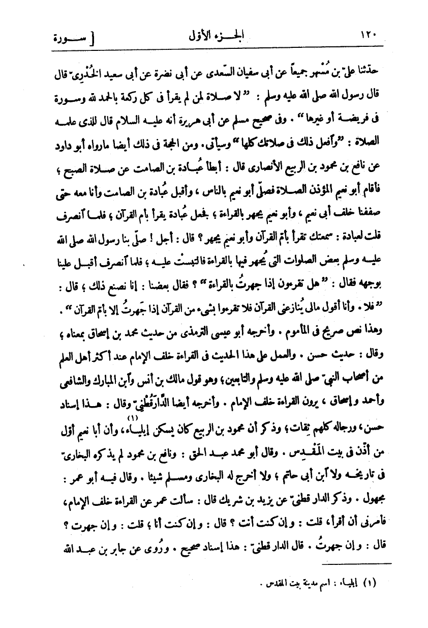حَدَّثَنَا عَلِيُّ بْنُ مُسْهِرٍ جَمِيعًا عَنْ أَبِي سُفْيَانَ السَّعْدِيِّ عَنْ أَبِي نَضْرَةَ عَنْ أَبِي سَعِيدٍ الْخُدْرِيِّ قَالَ قَالَ رَسُولُ اللَّهِ صَلَّى اللَّهُ عَلَيْهِ وَسَلَّمَ (لَا صَلَاةَ لِمَنْ لَمْ يَقْرَأْ فِي كُلِّ رَكْعَةٍ بِالْحَمْدُ لِلَّهِ وَسُورَةٍ فِي فَرِيضَةٍ أَوْ غَيْرِهَا). وَفِي صَحِيحِ مُسْلِمٍ عَنْ أَبِي هُرَيْرَةَ أَنَّهُ عَلَيْهِ السَّلَامُ قَالَ لِلَّذِي عَلَّمَهُ الصَّلَاةَ: (وَافْعَلْ ذَلِكَ فِي صَلَاتِكَ كُلِّهَا) وَسَيَأْتِي. وَمِنَ الْحُجَّةِ فِي ذَلِكَ أَيْضًا مَا رَوَاهُ أَبُو دَاوُدَ عَنْ نَافِعِ بْنِ مَحْمُودِ بْنِ الرَّبِيعِ الْأَنْصَارِيِّ قَالَ: أَبْطَأَ عُبَادَةُ بْنُ الصَّامِتِ عَنْ صَلَاةِ الصُّبْحِ، فَأَقَامَ أَبُو نُعَيْمٍ الْمُؤَذِّنُ الصَّلَاةَ فَصَلَّى أَبُو نُعَيْمٍ بِالنَّاسِ، وَأَقْبَلَ عُبَادَةُ بْنُ الصَّامِتِ وَأَنَا مَعَهُ حَتَّى صَفَفْنَا خَلْفَ أَبِي نُعَيْمٍ، وَأَبُو نُعَيْمٍ يَجْهَرُ بِالْقِرَاءَةِ، فَجَعَلَ عُبَادَةُ يَقْرَأُ بِأُمِّ الْقُرْآنِ، فَلَمَّا انْصَرَفَ قُلْتُ لِعُبَادَةَ: سَمِعْتُكَ تَقْرَأُ بِأُمِّ الْقُرْآنِ وَأَبُو نُعَيْمٍ يَجْهَرُ؟ قَالَ: أَجَلْ! صَلَّى بِنَا رَسُولُ اللَّهِ صَلَّى اللَّهُ عَلَيْهِ وَسَلَّمَ بَعْضَ الصَّلَوَاتِ الَّتِي يُجْهَرُ فِيهَا بِالْقِرَاءَةِ فَالْتَبَسَتْ عَلَيْهِ، فَلَمَّا انْصَرَفَ أَقْبَلَ عَلَيْنَا بِوَجْهِهِ فَقَالَ: (هَلْ تَقْرَءُونَ إِذَا جَهَرْتُ بِالْقِرَاءَةِ) فَقَالَ بَعْضُنَا: إِنَّا نَصْنَعُ ذَلِكَ، قَالَ: (فَلَا. وَأَنَا أَقُولُ مَا لِي يُنَازَعُنِي الْقُرْآنُ فَلَا تَقْرَءُوا بِشَيْءٍ مِنَ الْقُرْآنِ إِذَا جَهَرْتُ إِلَّا بِأُمِّ الْقُرْآنِ). وَهَذَا نَصٌّ صَرِيحٌ فِي الْمَأْمُومِ. وَأَخْرَجَهُ أَبُو عِيسَى التِّرْمِذِيُّ مِنْ حَدِيثِ مُحَمَّدِ بْنِ إِسْحَاقَ بِمَعْنَاهُ، وَقَالَ: حَدِيثٌ حَسَنٌ. وَالْعَمَلُ عَلَى هَذَا الْحَدِيثِ في القراءة خلق الْإِمَامِ عِنْدَ أَكْثَرِ أَهْلِ الْعِلْمِ مِنْ أَصْحَابِ النَّبِيِّ صَلَّى اللَّهُ عَلَيْهِ وَسَلَّمَ وَالتَّابِعِينَ، وَهُوَ قَوْلُ مَالِكِ بْنِ أَنَسٍ وَابْنِ الْمُبَارَكِ وَالشَّافِعِيِّ وَأَحْمَدَ وَإِسْحَاقَ، يَرَوْنَ الْقِرَاءَةَ خَلْفَ الْإِمَامِ. وَأَخْرَجَهُ أَيْضًا الدَّارَقُطْنِيُّ وَقَالَ: هَذَا إِسْنَادٌ حَسَنٌ، وَرِجَالُهُ كُلُّهُمْ ثِقَاتٌ، وَذَكَرَ أَنَّ مَحْمُودَ بْنَ الرَّبِيعِ كَانَ يَسْكُنُ إِيلِيَاءَ «١»، وَأَنَّ أَبَا نُعَيْمٍ أَوَّلُ مِنْ أَذَّنَ فِي بَيْتِ الْمَقْدِسِ. وَقَالَ أَبُو مُحَمَّدٍ عَبْدُ الْحَقِّ: وَنَافِعُ بْنُ مَحْمُودٍ لَمْ يَذْكُرْهُ الْبُخَارِيُّ فِي تَارِيخِهِ وَلَا ابْنُ أَبِي حَاتِمٍ، وَلَا أَخْرَجَ لَهُ الْبُخَارِيُّ وَمُسْلِمٌ شَيْئًا. وَقَالَ فِيهِ أَبُو عُمَرَ: مَجْهُولٌ. وَذَكَرَ الدَّارَقُطْنِيُّ عَنْ يَزِيدَ بْنِ شَرِيكٍ قَالَ: سَأَلْتُ عُمَرَ عَنِ الْقِرَاءَةِ خَلْفَ الْإِمَامِ، فَأَمَرَنِي أَنْ أَقْرَأَ، قُلْتُ: وَإِنْ كُنْتَ أَنْتَ؟ قَالَ: وَإِنْ كُنْتُ أَنَا، قُلْتُ: وَإِنْ جَهَرْتَ؟ قَالَ: وَإِنْ جَهَرْتُ. قَالَ الدَّارَقُطْنِيُّ: هَذَا إِسْنَادٌ صَحِيحٌ. وَرُوِيَ عَنْ جابر بن عبد الله