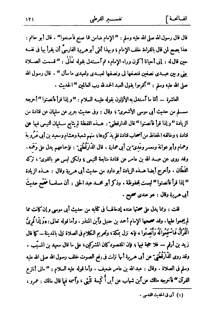 قَالَ: قَالَ رَسُولُ اللَّهِ صَلَّى اللَّهُ عَلَيْهِ وَسَلَّمَ: (الْإِمَامُ ضَامِنٌ فَمَا صَنَعَ فَاصْنَعُوا). قَالَ أَبُو حَاتِمٍ: هَذَا يَصِحُّ لِمَنْ قَالَ بِالْقِرَاءَةِ خَلْفَ الْإِمَامِ، وَبِهَذَا أَفْتَى أَبُو هُرَيْرَةَ الْفَارِسِيُّ أَنْ يَقْرَأَ بِهَا فِي نَفْسِهِ حِينَ قَالَ لَهُ: إِنِّي أَحْيَانًا أَكُونُ وَرَاءَ الْإِمَامِ، ثُمَّ استدل بقول تَعَالَى: «١» (قَسَمْتُ الصَّلَاةَ بَيْنِي وَبَيْنَ عَبْدِي نِصْفَيْنِ فَنِصْفُهَا لِي وَنِصْفُهَا لِعَبْدِي وَلِعَبْدِي مَا سَأَلَ (. قَالَ رَسُولُ اللَّهِ صَلَّى اللَّهُ عَلَيْهِ وَسَلَّمَ:) اقْرَءُوا يَقُولُ الْعَبْدُ الْحَمْدُ لِلَّهِ رَبِّ الْعالَمِينَ) الْحَدِيثَ. الْعَاشِرَةُ أَمَّا مَا اسْتَدَلَّ بِهِ الْأَوَّلُونَ بِقَوْلِهِ عَلَيْهِ السَّلَامُ: (وَإِذَا قَرَأَ فَأَنْصِتُوا) أَخْرَجَهُ مُسْلِمٌ مِنْ حَدِيثِ أَبِي مُوسَى الْأَشْعَرِيِّ، وَقَالَ: وَفِي حَدِيثِ جَرِيرٍ عَنْ سُلَيْمَانَ عَنْ قَتَادَةَ مِنَ الزِّيَادَةِ (وَإِذَا قَرَأَ فَأَنْصِتُوا) قَالَ الدَّارَقُطْنِيُّ: هَذِهِ اللَّفْظَةُ لَمْ يُتَابَعْ سُلَيْمَانُ التَّيْمِيُّ فِيهَا عَنْ قَتَادَةَ، وَخَالَفَهُ الْحُفَّاظُ مِنْ أَصْحَابِ قَتَادَةَ فَلَمْ يَذْكُرُوهَا، مِنْهُمْ شُعْبَةُ وَهِشَامٌ وَسَعِيدُ بْنُ أَبِي عَرُوبَةَ وَهَمَّامٌ وَأَبُو عَوَانَةَ وَمَعْمَرٌ وَعَدِيُّ بْنُ أَبِي عُمَارَةَ. قَالَ الدَّارَقُطْنِيُّ: فَإِجْمَاعُهُمْ يَدُلُّ عَلَى وَهَمِهِ. وَقَدْ رُوِيَ عَنْ عَبْدِ اللَّهِ بْنِ عَامِرٍ عَنْ قَتَادَةَ مُتَابَعَةُ التَّيْمِيِّ، وَلَكِنْ لَيْسَ هُوَ بِالْقَوِيِّ، تَرَكَهُ الْقَطَّانُ. وَأَخْرَجَ أَيْضًا هذه الزيادة أبو داود من حديت أَبِي هُرَيْرَةَ وَقَالَ: هَذِهِ الزِّيَادَةُ (إِذَا قَرَأَ فَأَنْصِتُوا) لَيْسَتْ بِمَحْفُوظَةٍ. وَذَكَرَ أَبُو مُحَمَّدٍ عَبْدُ الْحَقِّ: أَنَّ مُسْلِمًا صَحَّحَ حَدِيثَ أَبِي هُرَيْرَةَ وَقَالَ: هُوَ عِنْدِي صَحِيحٌ. قُلْتُ: وَمِمَّا يَدُلُّ عَلَى صِحَّتِهَا عِنْدَهُ إِدْخَالُهَا فِي كِتَابِهِ مِنْ حَدِيثِ أَبِي مُوسَى وَإِنْ كَانَتْ مِمَّا لَمْ يُجْمِعُوا عَلَيْهَا. وَقَدْ صَحَّحَهَا الْإِمَامُ أَحْمَدُ بْنُ حنبل وابن المنذر. وأما قول تَعَالَى:" وَإِذا قُرِئَ الْقُرْآنُ فَاسْتَمِعُوا لَهُ وَأَنْصِتُوا" [الأعراف: ٢٠٤] فَإِنَّهُ نَزَلَ بِمَكَّةَ، وَتَحْرِيمُ الْكَلَامِ فِي الصَّلَاةِ نَزَلَ بِالْمَدِينَةِ كَمَا قَالَ زَيْدُ بْنُ أَرْقَمَ فَلَا حُجَّةَ فِيهَا، فَإِنَّ الْمَقْصُودَ كَانَ الْمُشْرِكِينَ، عَلَى مَا قَالَ سَعِيدُ بْنُ الْمُسَيَّبِ. وَقَدْ رَوَى الدَّارَقُطْنِيُّ عَنْ أَبِي هُرَيْرَةَ أَنَّهَا نَزَلَتْ فِي رَفْعِ الصَّوْتِ خَلْفَ رَسُولِ اللَّهِ صَلَّى اللَّهُ عَلَيْهِ وَسَلَّمَ في الصلاة. وَقَالَ: عَبْدُ اللَّهِ بْنُ عَامِرٍ ضَعِيفٌ. وَأَمَّا قَوْلُهُ عَلَيْهِ السَّلَامُ: (مَا لِي أُنَازَعُ الْقُرْآنَ) فَأَخْرَجَهُ مَالِكٌ عَنِ ابْنِ شِهَابٍ عَنِ ابْنِ أُكَيْمَةَ اللَّيْثِيِّ، وَاسْمُهُ فِيمَا قَالَ مَالِكٌ: عَمْرٌو،
