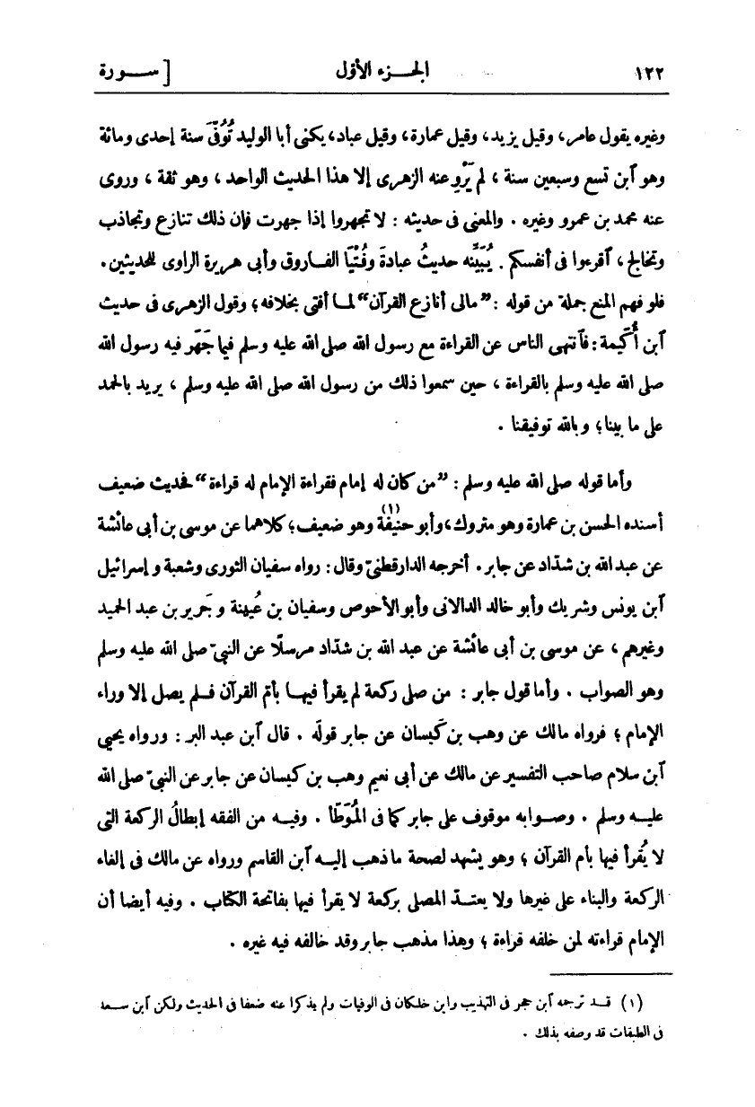 وَغَيْرُهُ يَقُولُ عَامِرٌ، وَقِيلَ يَزِيدُ، وَقِيلَ عُمَارَةُ، وَقِيلَ عَبَّادٌ، يُكْنَى أَبَا الْوَلِيدِ تُوُفِّيَ سَنَةَ إِحْدَى وَمِائَةٍ وَهُوَ ابْنُ تِسْعٍ وَسَبْعِينَ سَنَةً، لَمْ يَرْوِ عَنْهُ الزُّهْرِيُّ إِلَّا هَذَا الْحَدِيثَ الْوَاحِدَ، وَهُوَ ثِقَةٌ، وَرَوَى عَنْهُ مُحَمَّدُ بْنُ عَمْرٍو وَغَيْرُهُ. وَالْمَعْنَى فِي حَدِيثِهِ: لَا تَجْهَرُوا إِذَا جَهَرْتُ فَإِنَّ ذَلِكَ تَنَازُعٌ وَتَجَاذُبٌ وَتَخَالُجٌ، اقْرَءُوا فِي أَنْفُسِكُمْ. يُبَيِّنُهُ حَدِيثُ عُبَادَةَ وَفُتْيَا الْفَارُوقِ وَأَبِي هُرَيْرَةَ الرَّاوِي لِلْحَدِيثَيْنِ. فَلَوْ فُهِمَ الْمَنْعُ جُمْلَةً مِنْ قَوْلِهِ: (مَا لِي أُنَازَعُ الْقُرْآنَ) لَمَا أَفْتَى بِخِلَافِهِ، وَقَوْلُ الزُّهْرِيُّ فِي حَدِيثِ ابْنِ أُكَيْمَةَ: فَانْتَهَى النَّاسُ عَنِ الْقِرَاءَةِ مَعَ رَسُولِ اللَّهِ صَلَّى اللَّهُ عَلَيْهِ وَسَلَّمَ فِيمَا جَهَرَ فِيهِ رَسُولُ اللَّهِ صَلَّى اللَّهُ عَلَيْهِ وَسَلَّمَ بِالْقِرَاءَةِ، حِينَ سَمِعُوا ذَلِكَ مِنْ رَسُولِ اللَّهِ صَلَّى اللَّهُ عَلَيْهِ وَسَلَّمَ، يُرِيدُ بِالْحَمْدِ عَلَى مَا بَيَّنَّا، وَبِاللَّهِ تَوْفِيقُنَا. وَأَمَّا قَوْلُهُ صَلَّى اللَّهُ عَلَيْهِ وَسَلَّمَ: (مَنْ كَانَ لَهُ إِمَامٌ فَقِرَاءَةُ الْإِمَامِ لَهُ قِرَاءَةٌ) فَحَدِيثٌ ضَعِيفٌ أَسْنَدَهُ الْحَسَنُ بْنُ عُمَارَةَ وَهُوَ مَتْرُوكٌ، وَأَبُو حَنِيفَةَ «١» وَهُوَ ضَعِيفٌ، كِلَاهُمَا عَنْ مُوسَى بْنِ أَبِي عَائِشَةَ عَنْ عَبْدِ اللَّهِ بْنِ شَدَّادٍ عَنْ جَابِرٍ. أَخْرَجَهُ الدَّارَقُطْنِيُّ وَقَالَ: رَوَاهُ سفيان الثوري وشعبة وإسرائيل ابن يُونُسَ وَشَرِيكٌ وَأَبُو خَالِدٍ الدَّالَانِيُّ وَأَبُو الْأَحْوَصِ وَسُفْيَانُ بْنُ عُيَيْنَةَ وَجَرِيرُ بْنُ عَبْدِ الْحَمِيدِ وَغَيْرُهُمْ، عَنْ مُوسَى بْنِ أَبِي عَائِشَةَ عَنْ عَبْدِ اللَّهِ بْنِ شَدَّادٍ مُرْسَلًا عَنِ النَّبِيِّ صَلَّى اللَّهُ عَلَيْهِ وَسَلَّمَ وَهُوَ الصَّوَابُ. وَأَمَّا قَوْلُ جَابِرٍ: مَنْ صَلَّى رَكْعَةً لَمْ يَقْرَأْ فِيهَا بِأُمِّ الْقُرْآنِ فَلَمْ يُصَلِّ إِلَّا وَرَاءَ الْإِمَامِ، فَرَوَاهُ مَالِكٌ عَنْ وَهْبِ بْنِ كَيْسَانَ عَنْ جَابِرٍ قَوْلَهُ. قَالَ ابْنُ عَبْدِ الْبَرِّ: ورواه يحيى ابن سَلَّامٍ صَاحِبَ التَّفْسِيرِ عَنْ مَالِكٍ عَنْ أَبِي نُعَيْمٍ وَهْبِ بْنِ كَيْسَانَ عَنْ جَابِرٍ عَنِ النَّبِيِّ صَلَّى اللَّهُ عَلَيْهِ وَسَلَّمَ وَصَوَابُهُ مَوْقُوفٌ عَلَى جَابِرٍ كَمَا فِي الْمُوَطَّأِ. وَفِيهِ مِنَ الْفِقْهِ إِبْطَالُ الرَّكْعَةِ الَّتِي لَا يُقْرَأُ فِيهَا بِأُمِّ الْقُرْآنِ، وَهُوَ يَشْهَدُ لِصِحَّةِ مَا ذَهَبَ إِلَيْهِ ابْنُ الْقَاسِمِ وَرَوَاهُ عَنْ مَالِكٍ فِي إِلْغَاءِ الرَّكْعَةِ وَالْبِنَاءِ عَلَى غَيْرِهَا وَلَا يَعْتَدُّ الْمُصَلِّي بِرَكْعَةٍ لَا يَقْرَأُ فِيهَا بِفَاتِحَةِ الْكِتَابِ. وَفِيهِ أَيْضًا أَنَّ الْإِمَامَ قِرَاءَتُهُ لِمَنْ خَلْفُهُ قِرَاءَةٌ، وَهَذَا مَذْهَبُ جَابِرٍ وَقَدْ خَالَفَهُ فِيهِ غيره.