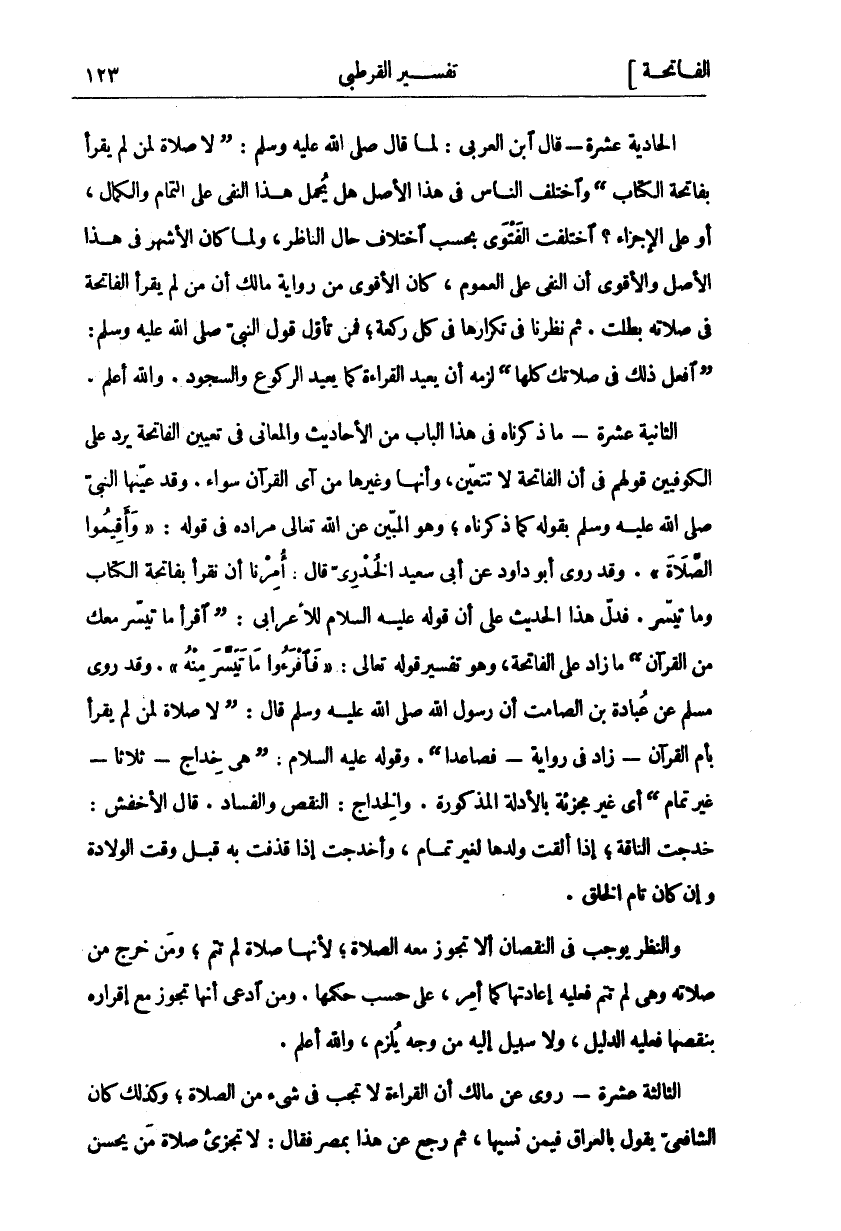 الْحَادِيَةَ عَشْرَةَ قَالَ ابْنُ الْعَرَبِيِّ: لَمَّا قَالَ صَلَّى اللَّهُ عَلَيْهِ وَسَلَّمَ: (لَا صَلَاةَ لِمَنْ لَمْ يَقْرَأْ بِفَاتِحَةِ الْكِتَابِ) وَاخْتَلَفَ النَّاسُ فِي هَذَا الْأَصْلِ هَلْ يُحْمَلُ هَذَا النَّفْيُ عَلَى التَّمَامِ وَالْكَمَالِ، أَوْ عَلَى الْإِجْزَاءِ؟ اخْتَلَفَتِ الْفَتْوَى بِحَسْبِ اخْتِلَافِ حَالِ النَّاظِرِ، وَلَمَّا كَانَ الْأَشْهَرُ فِي هَذَا الْأَصْلِ وَالْأَقْوَى أَنَّ النَّفْيَ عَلَى الْعُمُومِ، كَانَ الْأَقْوَى مِنْ رِوَايَةِ مَالِكٍ أَنَّ مَنْ لَمْ يَقْرَأِ الْفَاتِحَةَ فِي صَلَاتِهِ بَطَلَتْ. ثُمَّ نَظَرْنَا فِي تَكْرَارِهَا فِي كُلِّ رَكْعَةٍ، فَمَنْ تَأَوَّلَ قَوْلَ النَّبِيِّ صَلَّى اللَّهُ عَلَيْهِ وَسَلَّمَ: (افْعَلْ ذَلِكَ فِي صَلَاتِكَ كُلِّهَا) لَزِمَهُ أَنْ يُعِيدَ الْقِرَاءَةَ كَمَا يُعِيدُ الرُّكُوعَ وَالسُّجُودَ. وَاللَّهُ أَعْلَمُ. الثَّانِيَةَ عَشْرَةَ مَا ذَكَرْنَاهُ فِي هَذَا الْبَابِ مِنَ الْأَحَادِيثِ وَالْمَعَانِي فِي تَعْيِينِ الْفَاتِحَةِ يَرُدُّ عَلَى الْكُوفِيِّينَ قَوْلَهُمْ فِي أَنَّ الْفَاتِحَةَ لَا تَتَعَيَّنُ، وَأَنَّهَا وَغَيْرَهَا مِنْ آيِ الْقُرْآنِ سَوَاءٌ. وَقَدْ عَيَّنَهَا النَّبِيُّ صَلَّى اللَّهُ عَلَيْهِ وَسَلَّمَ بِقَوْلِهِ كَمَا ذَكَرْنَاهُ، وَهُوَ الْمُبَيِّنُ عَنِ اللَّهِ تَعَالَى مُرَادَهُ فِي قَوْلِهِ:" وَأَقِيمُوا الصَّلاةَ". وَقَدْ رَوَى أَبُو دَاوُدَ عَنْ أَبِي سَعِيدٍ الْخُدْرِيِّ قَالَ: أُمِرْنَا أَنْ نَقْرَأَ بِفَاتِحَةِ الْكِتَابِ وَمَا تَيَسَّرَ. فَدَلَّ هَذَا الْحَدِيثُ عَلَى أَنَّ قَوْلَهُ عَلَيْهِ السَّلَامُ لِلْأَعْرَابِيِّ: (اقْرَأْ مَا تَيَسَّرَ مَعَكَ مِنَ الْقُرْآنِ) مَا زَادَ عَلَى الْفَاتِحَةِ، وهو تفسير قوله تعالى:" فَاقْرَؤُا ما تَيَسَّرَ مِنْهُ" [المزمل: ٢٠] وَقَدْ رَوَى مُسْلِمٌ عَنْ عُبَادَةَ بْنِ الصَّامِتِ أَنَّ رَسُولَ اللَّهِ صَلَّى اللَّهُ عَلَيْهِ وَسَلَّمَ قَالَ:" لَا صَلَاةَ لِمَنْ لَمْ يَقْرَأْ بِأُمِّ الْقُرْآنِ زَادَ فِي رِوَايَةٍ فَصَاعِدًا". وَقَوْلُهُ عَلَيْهِ السَّلَامُ: (هِيَ خِدَاجٌ ثَلَاثًا غَيْرُ تَمَامٍ) أَيْ غَيْرُ مُجْزِئَةٍ بِالْأَدِلَّةِ الْمَذْكُورَةِ. وَالْخِدَاجُ: النَّقْصُ وَالْفَسَادُ. قَالَ الْأَخْفَشُ: خَدَجَتِ النَّاقَةُ، إِذَا أَلْقَتْ وَلَدَهَا لِغَيْرِ تَمَامٍ، وَأَخْدَجَتْ إِذَا قَذَفَتْ بِهِ قَبْلَ وَقْتِ الْوِلَادَةِ وَإِنْ كَانَ تَامَّ الْخَلْقِ. وَالنَّظَرُ يُوجِبُ فِي النُّقْصَانِ أَلَّا تَجُوزَ مَعَهُ الصَّلَاةُ، لِأَنَّهَا صَلَاةٌ لَمْ تَتِمْ، وَمَنْ خَرَجَ مِنْ صَلَاتِهِ وَهِيَ لَمْ تَتِمْ فَعَلَيْهِ إِعَادَتُهَا كَمَا أُمِرَ، عَلَى حَسَبِ حُكْمِهَا. وَمَنَ ادَّعَى أَنَّهَا تَجُوزُ مَعَ إِقْرَارِهِ بِنَقْصِهَا فَعَلَيْهِ الدَّلِيلُ، وَلَا سَبِيلَ إِلَيْهِ مِنْ وَجْهٍ يَلْزَمُ، وَاللَّهُ أَعْلَمُ. الثَّالِثَةَ عَشْرَةَ رُوِيَ عَنْ مَالِكٍ أَنَّ الْقِرَاءَةَ لا تجب في شي من الصَّلَاةِ، وَكَذَلِكَ كَانَ الشَّافِعِيُّ يَقُولُ بِالْعِرَاقِ فِيمَنْ نَسِيَهَا، ثُمَّ رَجَعَ عَنْ هَذَا بِمِصْرَ فَقَالَ: لَا تُجْزِئُ صَلَاةُ مَنْ يُحْسِنُ