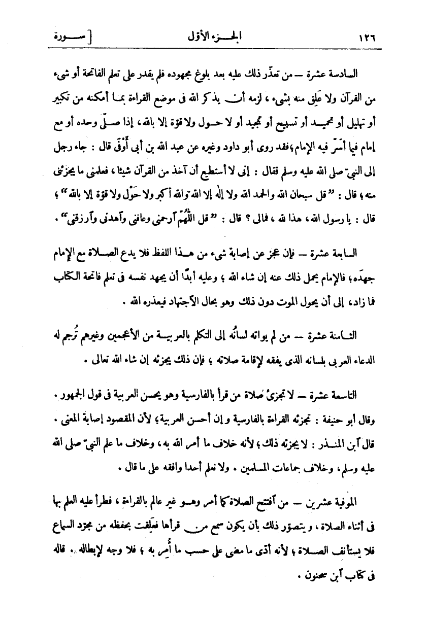 السَّادِسَةَ عَشْرَةَ: مَنْ تَعَذَّرَ ذَلِكَ عَلَيْهِ بَعْدَ بُلُوغِ مَجْهُودِهِ فَلَمْ يَقْدِرْ عَلَى تَعَلُّمِ الْفَاتِحَةِ أو شي مِنَ الْقُرْآنِ وَلَا عَلِقَ مِنْهُ بِشَيْءٍ، لَزِمَهُ أَنْ يَذْكُرَ اللَّهَ فِي مَوْضِعِ الْقِرَاءَةِ بِمَا أَمْكَنَهُ مِنْ تَكْبِيرٍ أَوْ تَهْلِيلٍ أَوْ تَحْمِيدٍ أَوْ تَسْبِيحٍ أَوْ تَمْجِيدٍ أَوْ لَا حَوْلَ وَلَا قُوَّةَ إِلَّا بِاللَّهِ، إِذَا صَلَّى وَحْدَهُ أَوْ مَعَ إِمَامٍ فِيمَا أَسَرَّ فِيهِ الْإِمَامُ، فَقَدْ رَوَى أَبُو دَاوُدَ وَغَيْرُهُ عَنْ عَبْدِ اللَّهِ بْنِ أَبِي أَوْفَى قَالَ: جَاءَ رَجُلٌ إِلَى النَّبِيِّ صَلَّى اللَّهُ عَلَيْهِ وَسَلَّمَ فَقَالَ: إِنِّي لَا أَسْتَطِيعُ أَنْ آخُذَ مِنَ الْقُرْآنِ شَيْئًا، فَعَلِّمْنِي مَا يُجْزِئْنِي مِنْهُ، قَالَ: (قُلْ سُبْحَانَ اللَّهِ وَالْحَمْدُ لِلَّهِ وَلَا إِلَهَ إِلَّا اللَّهُ وَاللَّهُ أَكْبَرُ وَلَا حَوْلَ وَلَا قُوَّةَ إِلَّا بِاللَّهِ)، قَالَ: يَا رَسُولَ اللَّهِ، هَذَا لِلَّهِ، فَمَا لِي؟ قَالَ: (قُلِ اللَّهُمَّ ارْحَمْنِي وَعَافِنِي وَاهْدِنِي وَارْزُقْنِي). السَّابِعَةَ عَشْرَةَ: فَإِنْ عَجَزَ عن إصابة شي مِنْ هَذَا اللَّفْظِ فَلَا يَدَعُ الصَّلَاةَ مَعَ الْإِمَامِ جُهْدَهُ، فَالْإِمَامُ يَحْمِلُ ذَلِكَ عَنْهُ إِنْ شَاءَ اللَّهُ، وَعَلَيْهِ أَبَدًا أَنْ يُجْهِدَ نَفْسَهُ فِي تَعَلُّمِ فَاتِحَةِ الْكِتَابِ فَمَا زَادَ، إِلَى أَنْ يَحُولَ الْمَوْتُ دُونَ ذَلِكَ وَهُوَ بِحَالِ الِاجْتِهَادِ فَيَعْذُرَهُ اللَّهُ. الثَّامِنَةَ عَشْرَةَ: مَنْ لَمْ يواته لسانه إلى التكلم بالعربية من الأعجمين وَغَيْرِهِمْ تُرْجِمَ لَهُ الدُّعَاءُ الْعَرَبِيُّ بِلِسَانِهِ الَّذِي يَفْقَهُ لِإِقَامَةِ صَلَاتِهِ، فَإِنَّ ذَلِكَ يُجْزِئُهُ إِنْ شَاءَ اللَّهُ تَعَالَى. التَّاسِعَةَ عَشْرَةَ: لَا تُجْزِئُ صَلَاةُ مَنْ قَرَأَ بِالْفَارِسِيَّةِ وَهُوَ يُحْسِنُ الْعَرَبِيَّةَ فِي قَوْلِ الْجُمْهُورِ. وَقَالَ أَبُو حَنِيفَةَ: تُجْزِئُهُ الْقِرَاءَةُ بِالْفَارِسِيَّةِ وَإِنْ أَحْسَنَ الْعَرَبِيَّةَ، لِأَنَّ الْمَقْصُودَ إِصَابَةُ الْمَعْنَى. قَالَ ابْنُ الْمُنْذِرِ: لَا يُجْزِئُهُ ذَلِكَ، لِأَنَّهُ خِلَافُ مَا أَمَرَ اللَّهُ بِهِ، وَخِلَافُ مَا عَلَّمَ النَّبِيُّ صَلَّى اللَّهُ عَلَيْهِ وَسَلَّمَ، وَخِلَافُ جَمَاعَاتِ الْمُسْلِمِينَ. وَلَا نَعْلَمُ أَحَدًا وَافَقَهُ عَلَى مَا قَالَ. الْمُوفِيَةُ عِشْرِينَ: مَنْ افْتَتَحَ الصَّلَاةَ كَمَا أُمِرَ وَهُوَ غَيْرُ عَالِمٍ بِالْقِرَاءَةِ، فَطَرَأَ عَلَيْهِ الْعِلْمُ بِهَا فِي أَثْنَاءِ الصَّلَاةِ، وَيُتَصَوَّرُ ذَلِكَ بِأَنْ يَكُونَ سَمِعَ مَنْ قَرَأَهَا فَعَلِقَتْ بِحِفْظِهِ مِنْ مُجَرَّدِ السَّمَاعِ فَلَا يَسْتَأْنِفُ الصَّلَاةَ، لِأَنَّهُ أَدَّى مَا مَضَى عَلَى حَسَبٍ مَا أُمِرَ بِهِ، فَلَا وَجْهَ